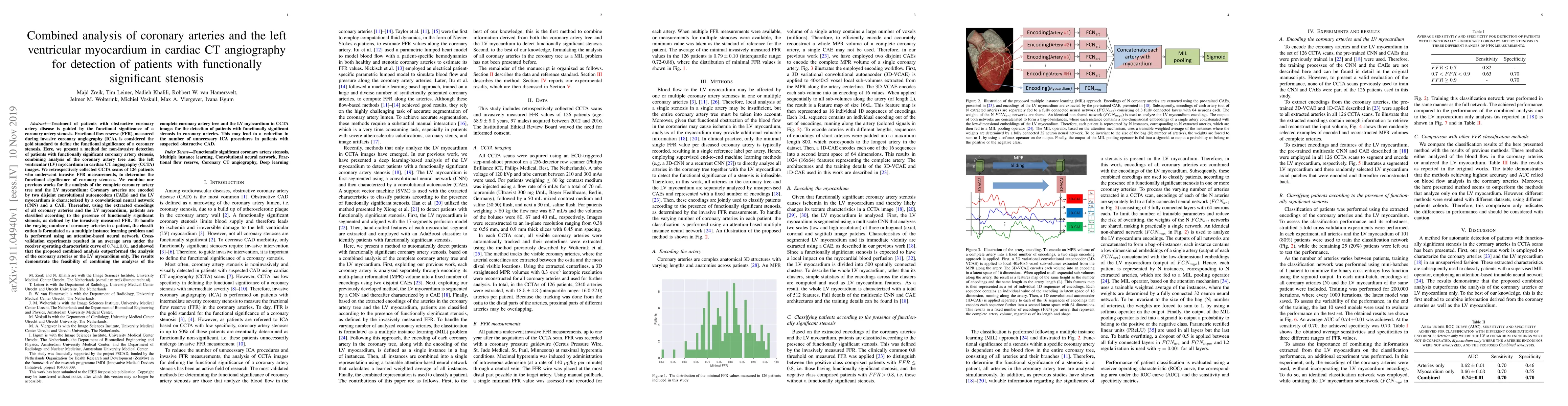 This study proposes a non-invasive method using cardiac CT angiography (CCTA) to detect functionally significant coronary artery stenosis by combining analyses of the coronary arteries and left ventricular myocardium. The method achieved an average AUC of 0.74, outperforming separate analyses, indicating its potential to replace invasive procedures.