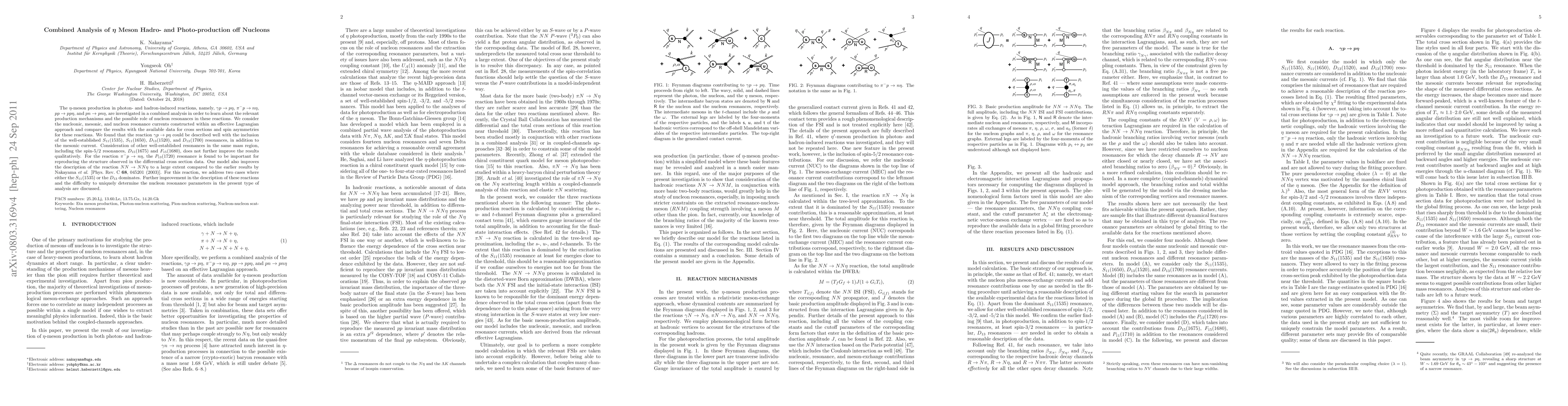 The $\eta$-meson production in photon- and hadron-induced reactions, namely, $\gamma p \to p \eta$, $\pi^- p \to n \eta$, $pp \to pp\eta$, and $pn \to pn\eta$, are investigated in a combined analysis in order to learn about the relevant production mechanisms and the possible role of nucleon resonances in these reactions. We consider the nucleonic, mesonic, and nucleon resonance currents constructed within an effective Lagrangian approach and compare the results with the available data for cross sections and spin asymmetries for these reactions. We found that the reaction $\gamma p \to p \eta$ could be described well with the inclusion of the well-established $S_{11}(1535)$, $S_{11}(1650)$, $D_{13}(1520)$, and $D_{13}(1700)$ resonances, in addition to the mesonic current. Consideration of other well-established resonances in the same mass region, including the spin-5/2 resonances, $D_{15}(1675)$ and $F_{15}(1680)$, does not further improve the results qualitatively. For the reaction $\pi^- p \to n \eta$, the $P_{13}(1720)$ resonance is found to be important for reproducing the structure observed in the differential cross section data. Our model also improves the description of the reaction $NN \to NN\eta$ to a large extent compared to the earlier results by Nakayama \textit{et al.} [Phys.\ Rev.\ C \textbf{68}, 045201 (2003)]. For this reaction, we address two cases where either the $S_{11}(1535)$ or the $D_{13}$ dominates. Further improvement in the description of these reactions and the difficulty to uniquely determine the nucleon resonance parameters in the present type of analysis are discussed.