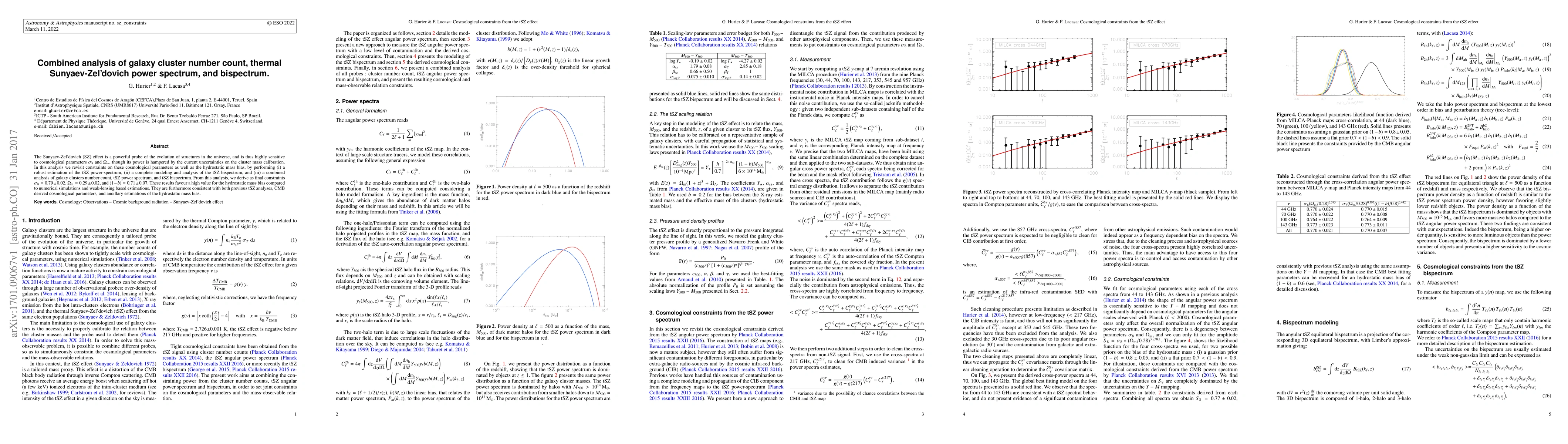 The Sunyaev-Zel'dovich (SZ) effect is a powerful probe of the evolution of structures in the universe, and is thus highly sensitive to cosmological parameters $\sigma_8$ and $\Omega_m$, though its power is hampered by the current uncertainties on the cluster mass calibration. In this analysis we revisit constraints on these cosmological parameters as well as the hydrostatic mass bias, by performing (i) a robust estimation of the tSZ power-spectrum, (ii) a complete modeling and analysis of the tSZ bispectrum, and (iii) a combined analysis of galaxy clusters number count, tSZ power spectrum, and tSZ bispectrum. From this analysis, we derive as final constraints $\sigma_8 = 0.79 \pm 0.02$, $\Omega_{\rm m} = 0.29 \pm 0.02$, and $(1-b) = 0.71 \pm 0.07$. These results favour a high value for the hydrostatic mass bias compared to numerical simulations and weak-lensing based estimations. They are furthermore consistent with both previous tSZ analyses, CMB derived cosmological parameters, and ancillary estimations of the hydrostatic mass bias.