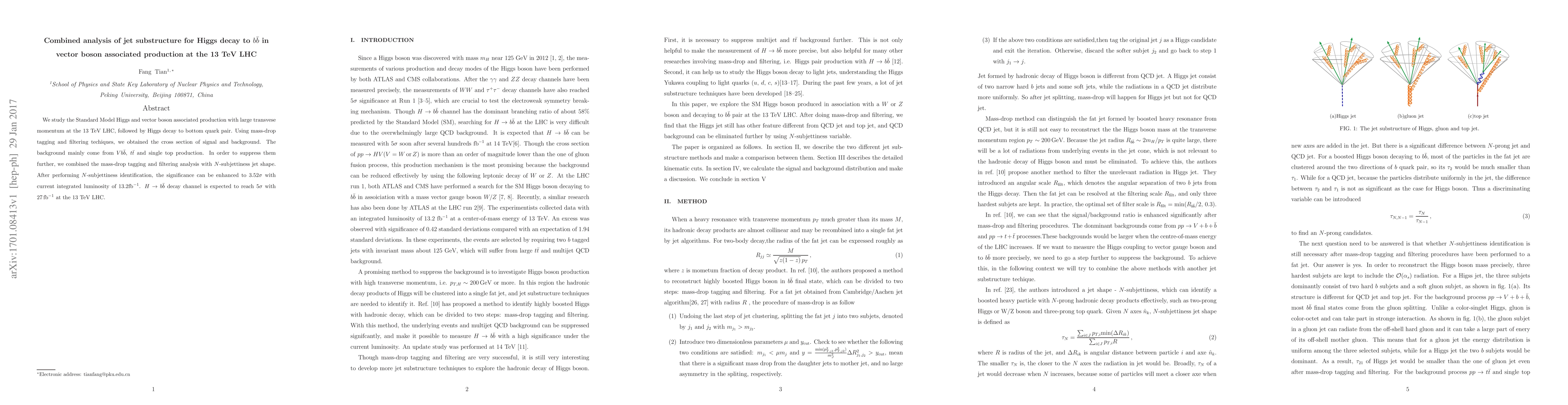 This paper investigates the Higgs boson decay to a bottom quark pair in vector boson associated production at the 13 TeV LHC, employing mass-drop tagging and filtering techniques to distinguish signal from background. The study enhances significance to 3.52σ by combining these methods with $N$-subjettiness analysis, projecting a 5σ discovery potential with 27 fb$^{-1}$ of data.