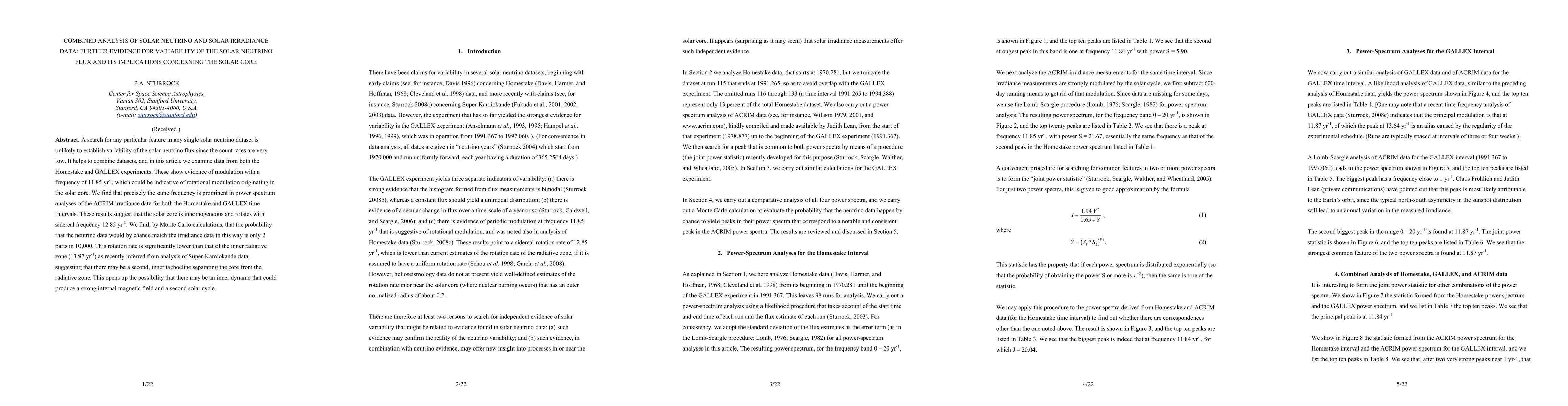 A search for any particular feature in any single solar neutrino dataset is unlikely to establish variability of the solar neutrino flux since the count rates are very low. It helps to combine datasets, and in this article we examine data from both the Homestake and GALLEX experiments. These show evidence of modulation with a frequency of 11.85 yr-1, which could be indicative of rotational modulation originating in the solar core. We find that precisely the same frequency is prominent in power spectrum analyses of the ACRIM irradiance data for both the Homestake and GALLEX time intervals. These results suggest that the solar core is inhomogeneous and rotates with sidereal frequency 12.85 yr-1. We find, by Monte Carlo calculations, that the probability that the neutrino data would by chance match the irradiance data in this way is only 2 parts in 10,000. This rotation rate is significantly lower than that of the inner radiative zone (13.97 yr-1) as recently inferred from analysis of Super-Kamiokande data, suggesting that there may be a second, inner tachocline separating the core from the radiative zone. This opens up the possibility that there may be an inner dynamo that could produce a strong internal magnetic field and a second solar cycle.