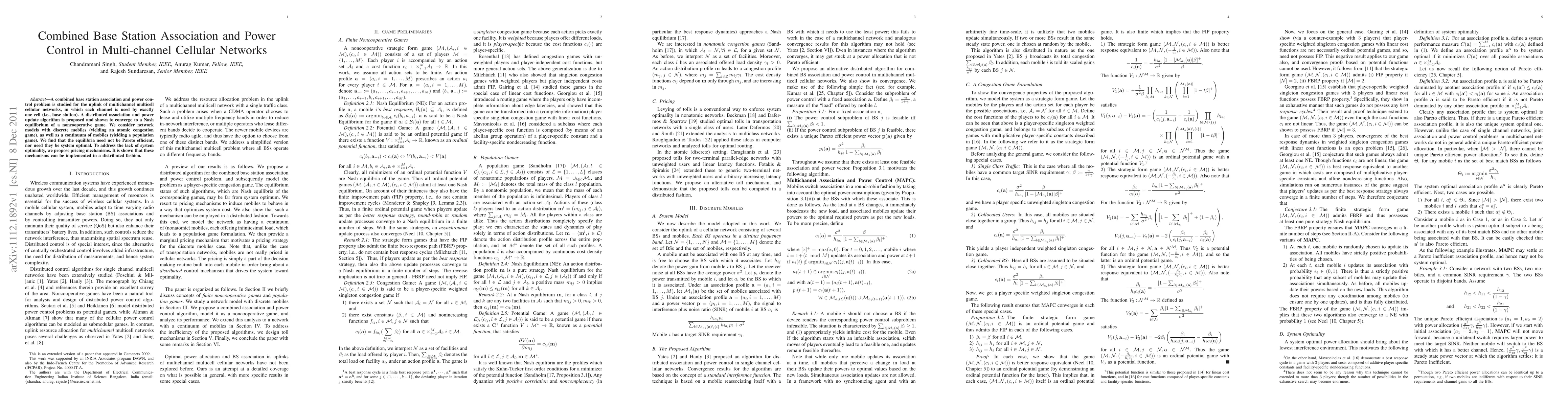 This paper proposes a distributed algorithm for base station association and power control in multi-channel cellular networks, demonstrating convergence to a Nash equilibrium. It addresses the lack of system optimality in equilibria through distributed pricing mechanisms.