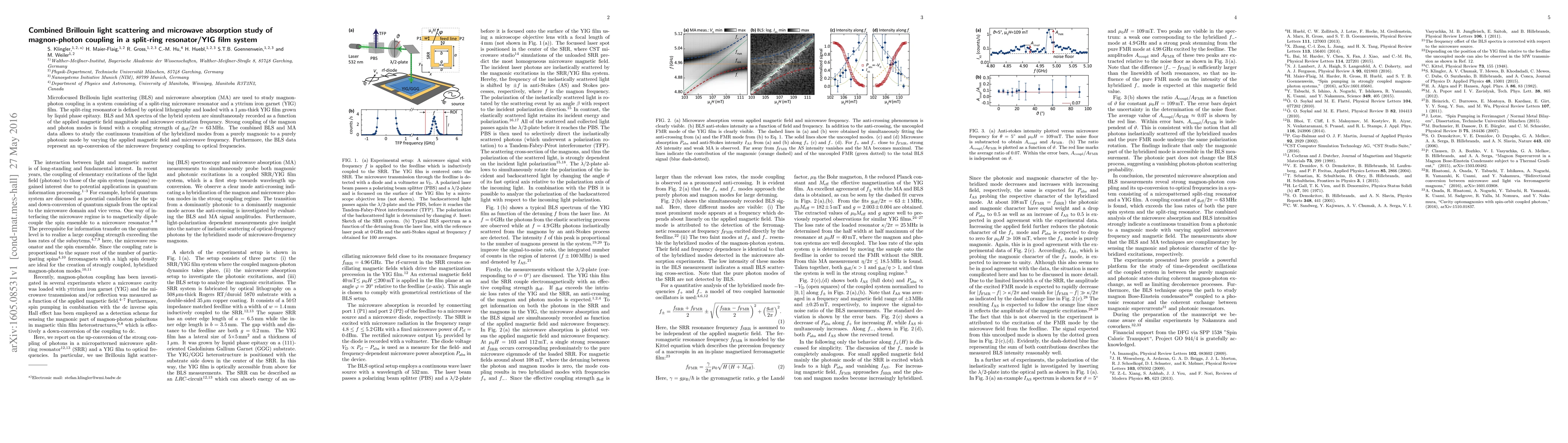 Microfocused Brillouin light scattering (BLS) and microwave absorption (MA) are used to study magnon-photon coupling in a system consisting of a split-ring microwave resonator and a yttrium iron garnet (YIG) film. The split-ring resonantor is defined by optical lithography and loaded with a 1 $\mu$m-thick YIG film grown by liquid phase epitaxy. BLS and MA spectra of the hybrid system are simultaneously recorded as a function of the applied magnetic field magnitude and microwave excitation frequency. Strong coupling of the magnon and photon modes is found with a coupling strength of $g_\text{eff}/2 \pi = 63$ MHz. The combined BLS and MA data allows to study the continuous transition of the hybridized modes from a purely magnonic to a purely photonic mode by varying the applied magnetic field and microwave frequency. Furthermore, the BLS data represent an up-conversion of the microwave frequency coupling to optical frequencies.