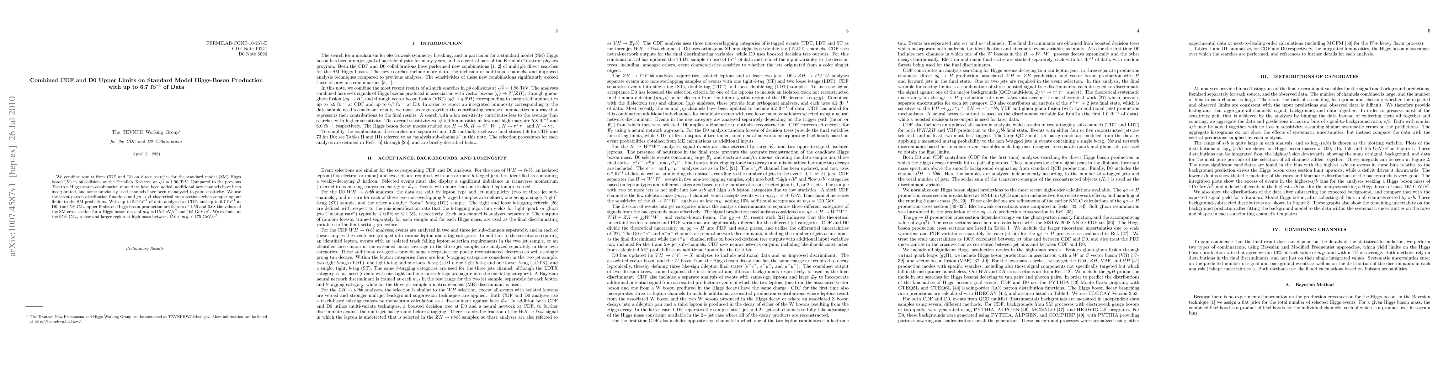 analyzed at CDF, and up to 6.7 fb-1 at D0, the 95% C.L. upper limits on Higgs