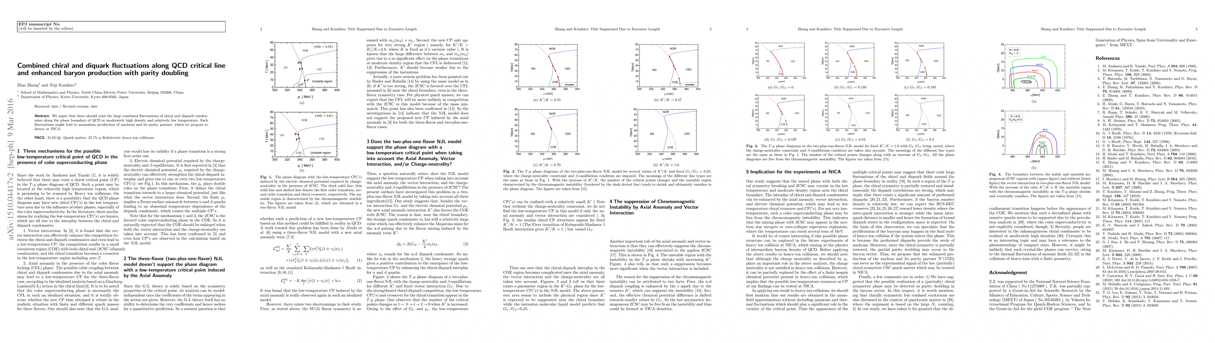 We argue that there should exist the large combined fluctuations of chiral and diquark condensates along the phase boundary of QCD at moderately high density and relatively low temperature. Such fluctuations might lead to anomalous production of nucleons and its parity partner, which we propose to detect at NICA.