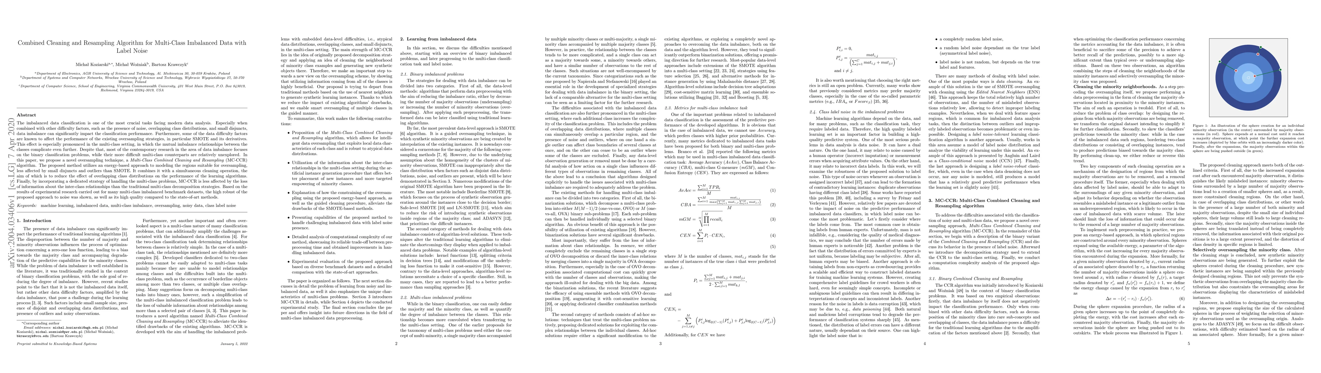 This paper proposes a novel Multi-Class Combined Cleaning and Resampling (MC-CCR) algorithm to address multi-class imbalanced data with label noise. The method combines an energy-based oversampling approach with a cleaning operation to improve classification performance, showing robustness and superior results compared to existing methods.
