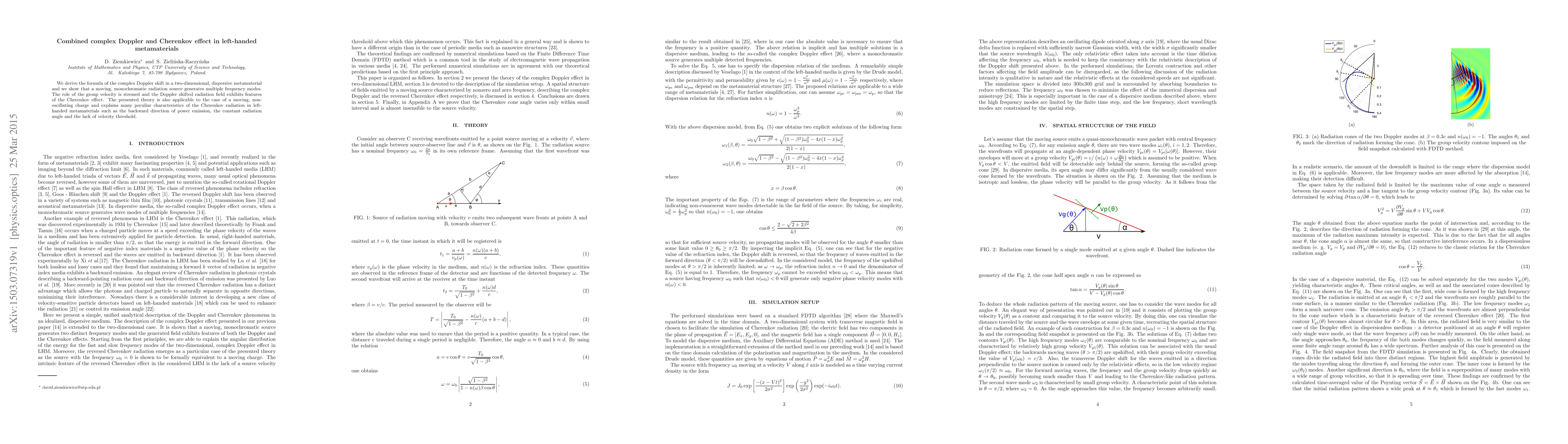 We derive the formula of the complex Doppler shift in a two-dimensional, dispersive metamaterial and we show that a moving, monochromatic radiation source generates multiple frequency modes. The role of the group velocity is stressed and the Doppler shifted radiation field exhibits features of the Cherenkov effect. The presented theory is also applicable to the case of a moving, nonoscillating charge and explains many peculiar characteristics of the Cherenkov radiation in lefthanded metamaterials such as the backward direction of power emission, the constant radiation angle and the lack of velocity threshold.