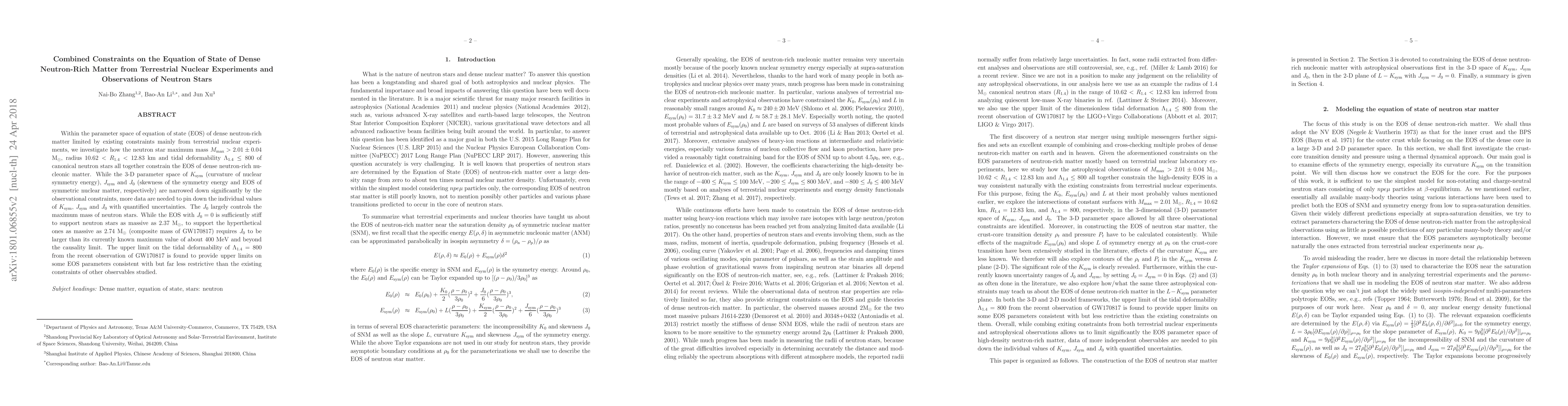 This paper combines terrestrial nuclear experiments and neutron star observations to constrain the equation of state (EOS) of dense neutron-rich matter. It finds that while neutron star maximum mass, radius, and tidal deformability significantly narrow the EOS parameters, more data are needed to precisely determine individual values.