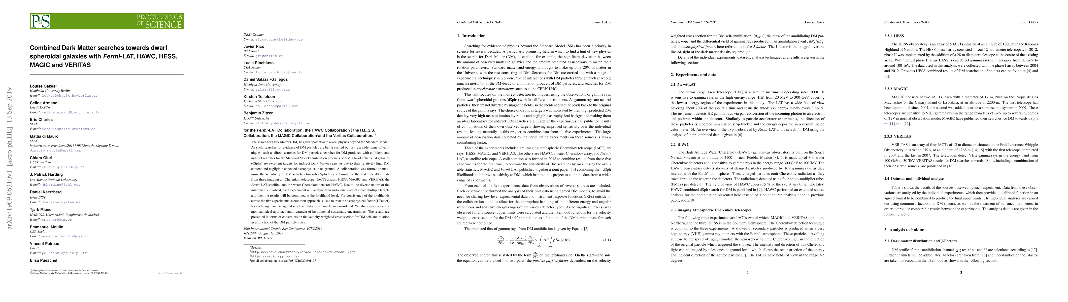 A collaboration was formed to combine data from five experiments (Fermi-LAT, HAWC, HESS, MAGIC, and VERITAS) targeting dwarf spheroidal galaxies (dSphs) for indirect dark matter (DM) searches. Each experiment analyzed their individual datasets using agreed DM models, and the results were combined at the likelihood level, considering common statistical approaches and instrumental systematic uncertainties.