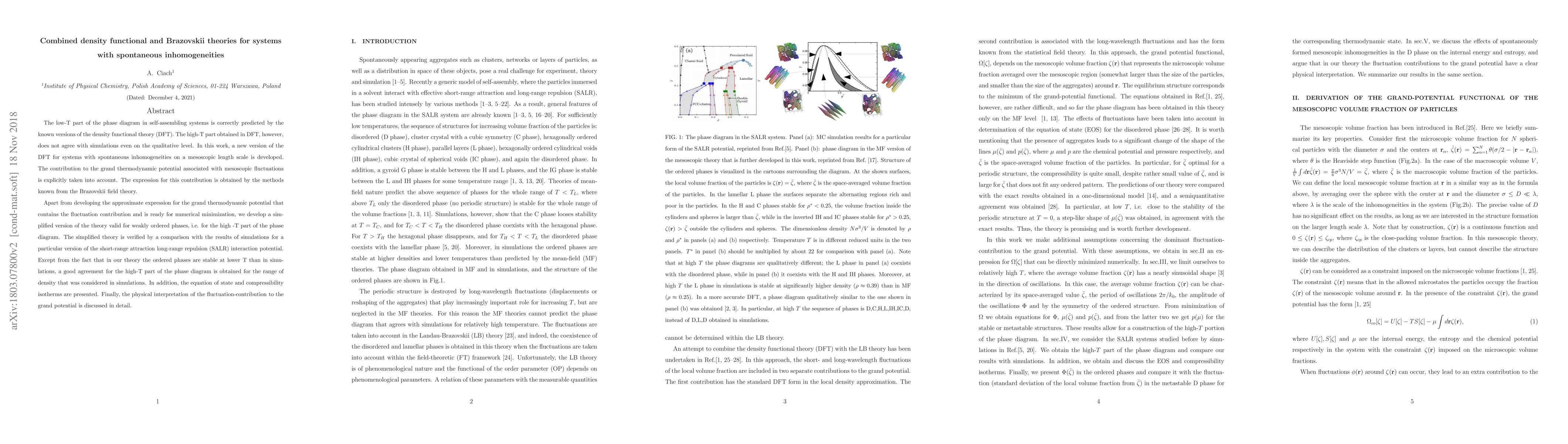 The low-T part of the phase diagram in self-assembling systems is correctly predicted by the known versions of the density functional theory (DFT). The high-T part obtained in DFT, however, does not agree with simulations even on the qualitative level. In this work a new version of the DFT is developed. The contribution to the grand thermodynamic potential associated with mesoscopic fluctuations is explicitly taken into account. The expression for this contribution is obtained by the methods known from the Brazovskii field theory. Apart from developing the approximate expression for the grand thermodynamic potential that contains the fluctuation contribution and is ready for numerical minimization, we develop a simplified version of the theory valid for weakly ordered phases, i.e. for the high -T part of the phase diagram. The simplified theory is verified by a comparison with the results of simulations for a particular version of the short-range attraction long-range repulsion (SALR) interaction potential. Except from the fact that in our theory the ordered phases are stable at lower T than in simulations, a good agreement for the high-T part of the phase diagram is obtained for the range of density that was considered in simulations. In addition, the equation of state and compressibility isotherms are presented. Finally, the physical interpretation of the fluctuation-contribution to the grand potential is discussed in detail.