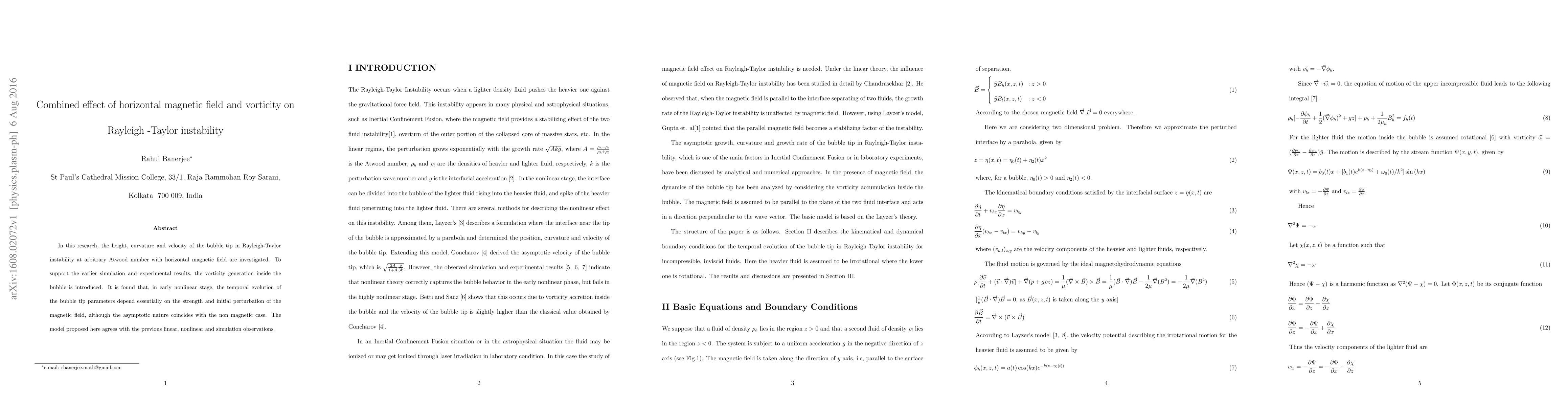 This study investigates the combined effect of a horizontal magnetic field and vorticity on Rayleigh-Taylor instability, focusing on bubble tip height, curvature, and velocity at arbitrary Atwood numbers. The results show that magnetic field strength and initial perturbations significantly influence early nonlinear stage evolution, though the asymptotic behavior aligns with non-magnetic cases.
