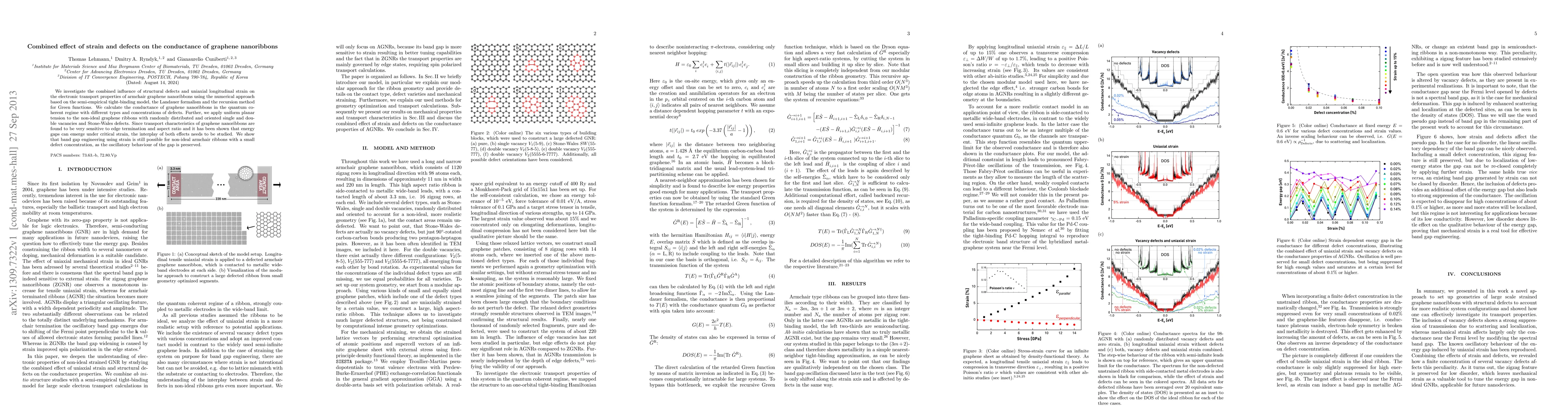This study examines how structural defects and longitudinal strain jointly affect the electronic transport of armchair graphene nanoribbons using a semiempirical tight-binding model. It reveals that strain can still enable band gap engineering in defective graphene nanoribbons despite the presence of small defect concentrations.