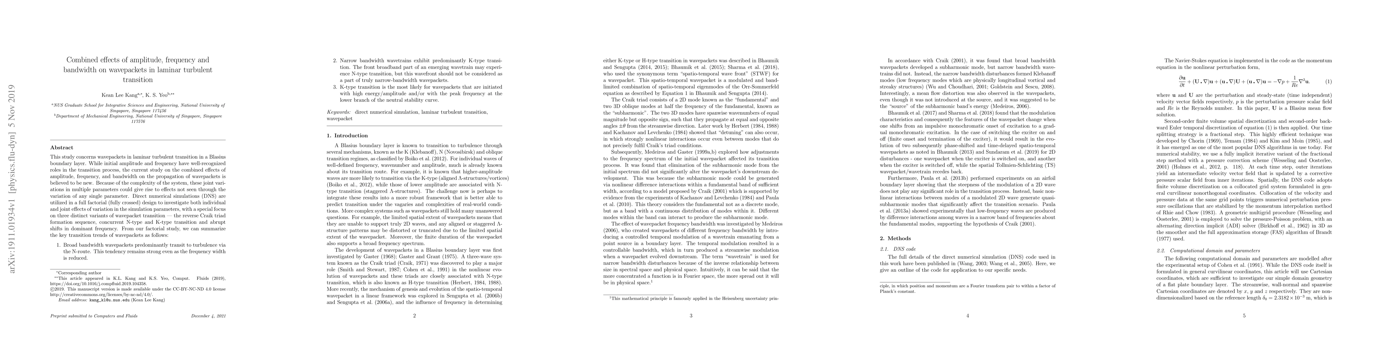 This study concerns wavepackets in laminar turbulent transition in a Blasius boundary layer. While initial amplitude and frequency have well-recognized roles in the transition process, the current study on the combined effects of amplitude, frequency, and bandwidth on the propagation of wavepackets is believed to be new. Because of the complexity of the system, these joint variations in multiple parameters could give rise to effects not seen through the variation of any single parameter. Direct numerical simulations (DNS) are utilized in a full factorial (fully crossed) design to investigate both individual and joint effects of variation in the simulation parameters, with a special focus on three distinct variants of wavepacket transition {\textemdash} the reverse Craik triad formation sequence, concurrent N-type and K-type transition and abrupt shifts in dominant frequency. From our factorial study, we can summarize the key transition trends of wavepackets as follows: 1. Broad bandwidth wavepackets predominantly transit to turbulence via the N-route. This tendency remains strong even as the frequency width is reduced. 2. Narrow bandwidth wavetrains exhibit predominantly K-type transition. The front broadband part of an emerging wavetrain may experience N-type transition, but this wavefront should not be considered as a part of truly narrow-bandwidth wavepackets. 3. K-type transition is the most likely for wavepackets that are initiated with high energy/amplitude and/or with the peak frequency at the lower branch of the neutral stability curve.
