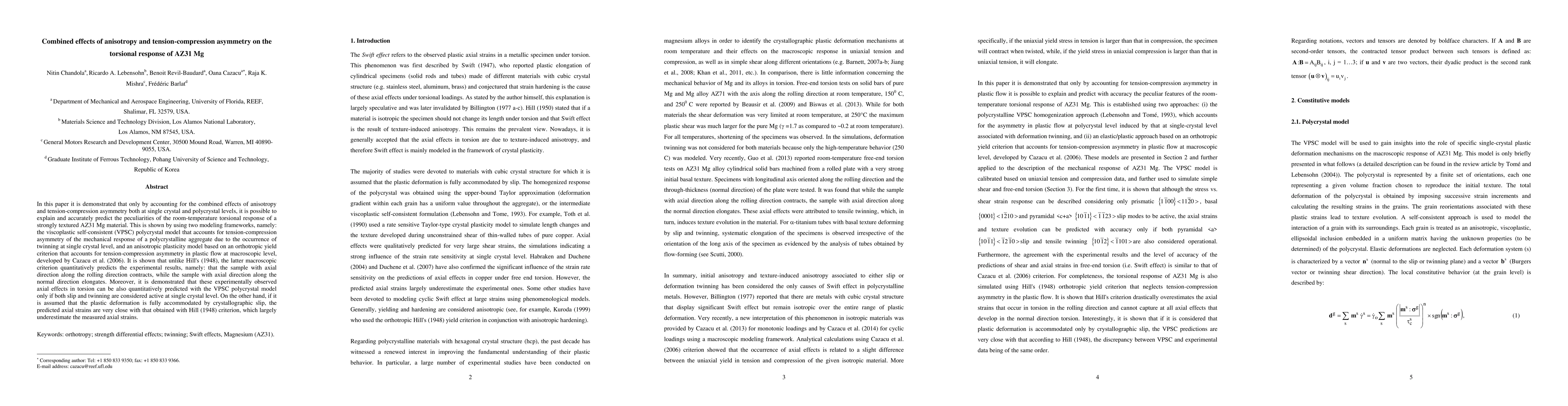 This paper investigates how anisotropy and tension-compression asymmetry influence the torsional response of AZ31 Mg, demonstrating that a combined approach using the VPSC polycrystal model and an orthotropic yield criterion can accurately predict the material's behavior, unlike traditional methods. The study highlights that considering both slip and twinning mechanisms is crucial for precise predictions.