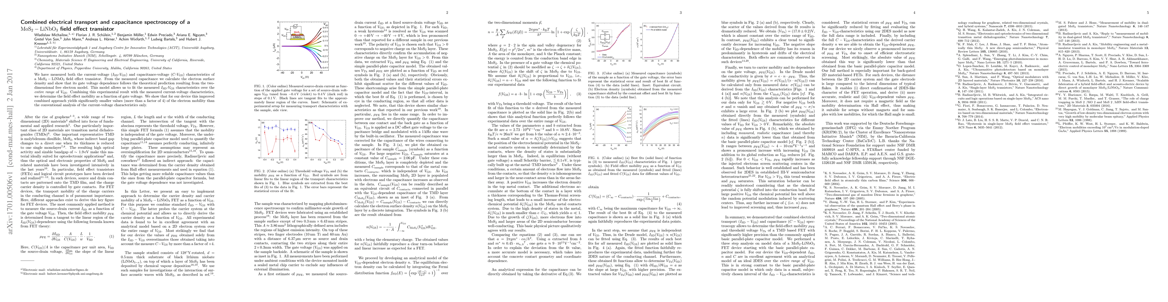 We have measured both the current-voltage ($I_\mathrm{SD}$-$V_\mathrm{GS}$) and capacitance-voltage ($C$-$V_\mathrm{GS}$) characteristics of a $\mathrm{MoS_2-LiNbO_3}$ field effect transistor. From the measured capacitance we calculate the electron surface density and show that its gate voltage dependence follows the theoretical prediction resulting from the two-dimensional free electron model. This model allows us to fit the measured $I_\mathrm{SD}$-$V_\mathrm{GS}$ characteristics over the \emph{entire range} of $V_\mathrm{GS}$. Combining this experimental result with the measured current-voltage characteristics, we determine the field effect mobility as a function of gate voltage. We show that for our device this improved combined approach yields significantly smaller values (more than a factor of 4) of the electron mobility than the conventional analysis of the current-voltage characteristics only.