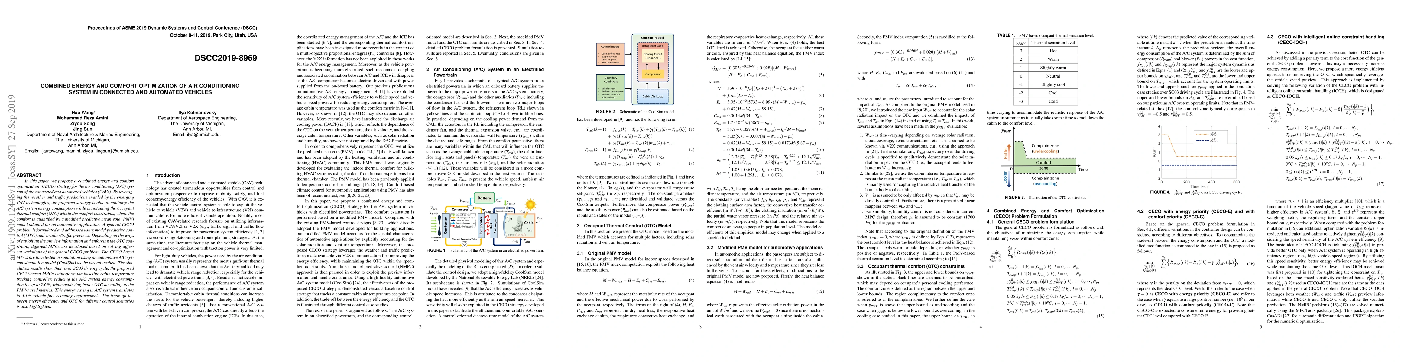 This paper proposes a combined energy and comfort optimization (CECO) strategy for the air conditioning system in connected and automated vehicles (CAVs) to minimize energy use while maintaining thermal comfort. Simulation results show a 7.6% reduction in A/C energy consumption and a 3.1% improvement in vehicle fuel economy, outperforming traditional controllers.