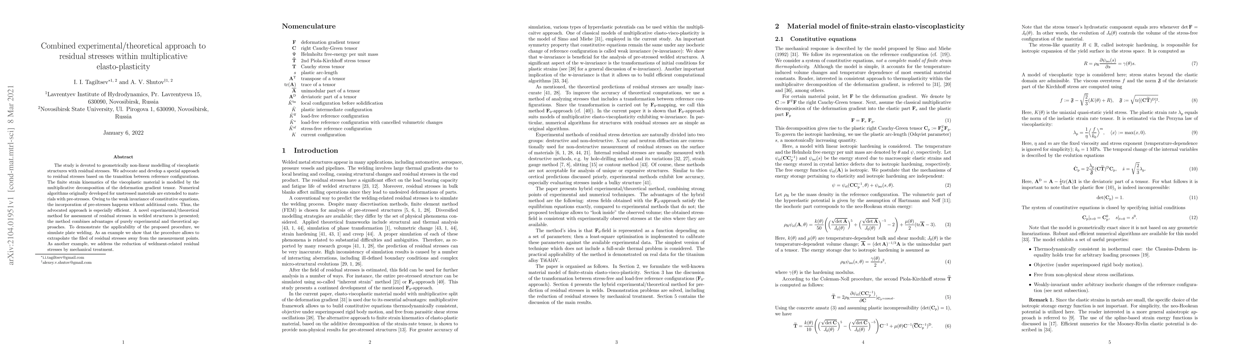 This paper proposes a combined experimental/theoretical method for modeling and assessing residual stresses in geometrically non-linear viscoplastic structures, utilizing a multiplicative decomposition of the deformation gradient tensor. The method efficiently incorporates pre-stresses and demonstrates its applicability through simulations of plate welding and reduction of weldment-related stresses.