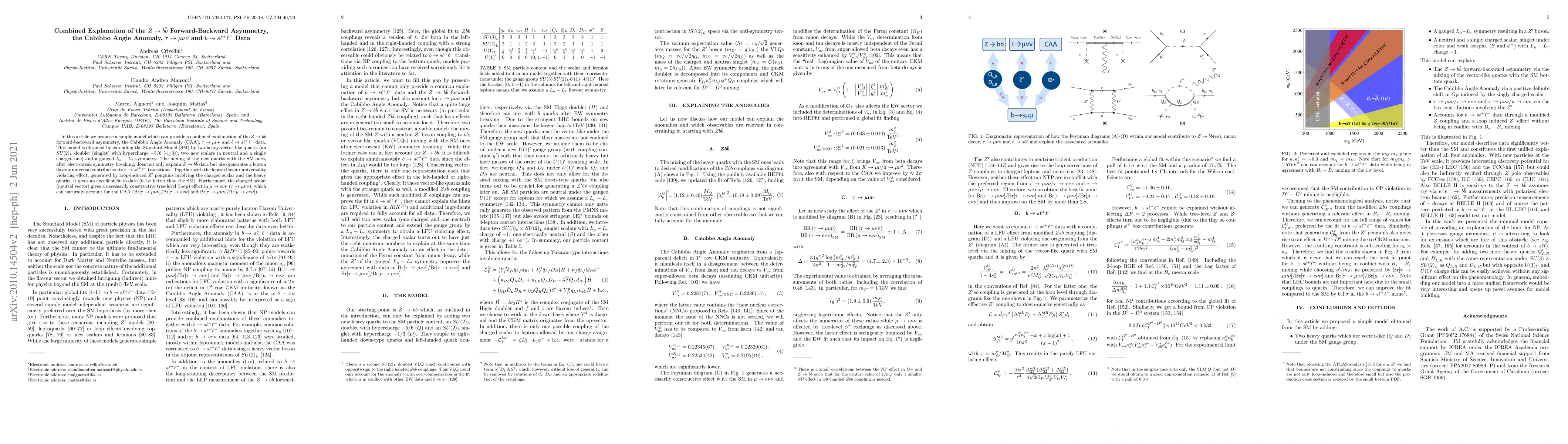 In this article we propose a simple model which can provide a combined explanation of the $Z\to b\bar b$ forward-backward asymmetry, the Cabibbo Angle Anomaly (CAA), $\tau\to\mu\nu\nu$ and $b\to s\ell^+\ell^-$ data. This model is obtained by extending the Standard Model (SM) by two heavy vector-like quarks (an $SU(2)_L$ doublet (singlet) with hypercharge $-5/6$ (-1/3)), two new scalars (a neutral and a singly charged one) and a gauged $L_\mu-L_\tau$ symmetry. The mixing of the new quarks with the SM ones, after electroweak symmetry breaking, does not only explain $Z\to b\bar b$ data but also generates a lepton flavour universal contribution to $b\to s\ell^+\ell^-$ transitions. Together with the lepton flavour universality violating effect, generated by loop-induced $Z^\prime$ penguins involving the charged scalar and the heavy quarks, it gives an excellent fit to data ($6.1\,\sigma$ better than the SM). Furthermore, the charged scalar (neutral vector) gives a necessarily constructive tree-level (loop) effect in $\mu\to e\nu\nu$ ($\tau\to \mu\nu\nu$), which can naturally account for the CAA (${\rm Br}[\tau\to\mu\nu\nu]/{\rm Br}[\tau\to e\nu\nu]$ and ${\rm Br}[\tau\to\mu\nu\nu]/{\rm Br}[\mu\to e\nu\nu]$).