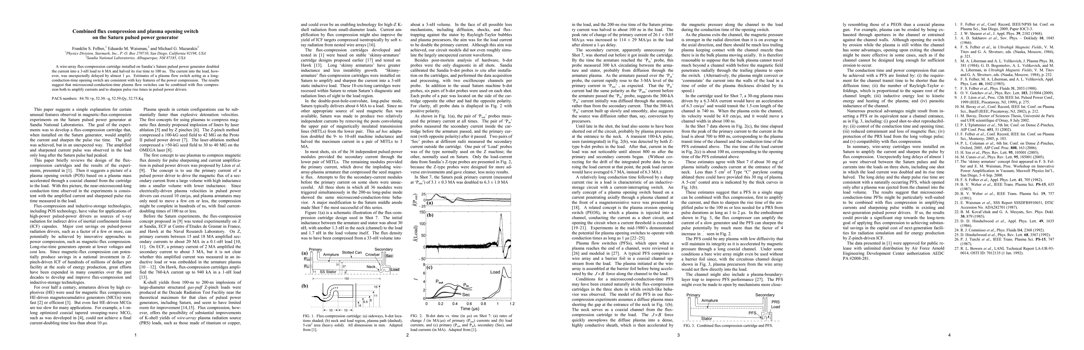 This study demonstrates that a wire-array flux-compression cartridge on the Saturn pulsed power generator effectively doubles current and reduces rise time, though with an unexpected microsecond delay. The findings suggest that combining microsecond-conduction-time plasma flow switches with flux compression can amplify currents and improve pulse rise times in pulsed power applications.