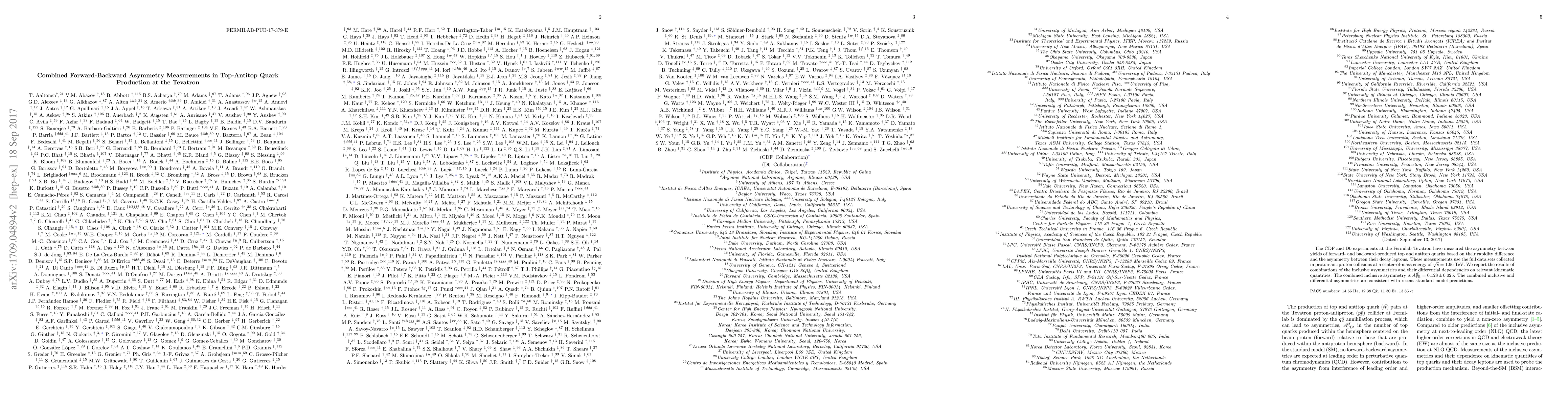 The CDF and D0 experiments combined their measurements of forward-backward asymmetry in top-antitop quark production at the Tevatron, reporting an inclusive asymmetry of $A_{\mathrm{FB}}^{t\bar{t}} = 0.128 \pm 0.025$ that aligns with standard model predictions.