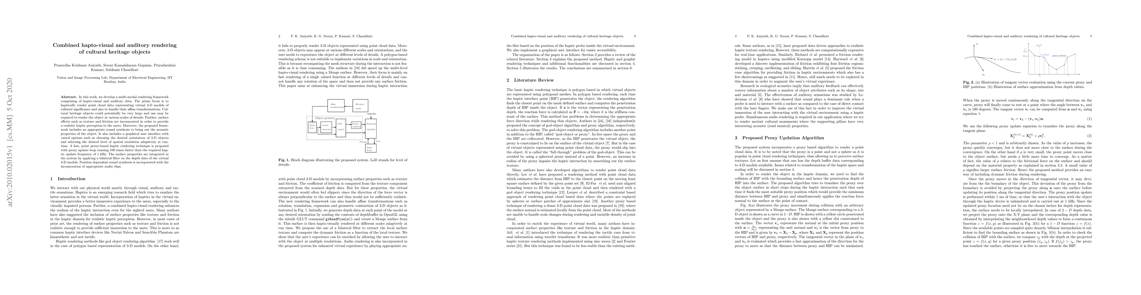 In this work, we develop a multi-modal rendering framework comprising of hapto-visual and auditory data. The prime focus is to haptically render point cloud data representing virtual 3-D models of cultural significance and also to handle their affine transformations. Cultural heritage objects could potentially be very large and one may be required to render the object at various scales of details. Further, surface effects such as texture and friction are incorporated in order to provide a realistic haptic perception to the users. Moreover, the proposed framework includes an appropriate sound synthesis to bring out the acoustic properties of the object. It also includes a graphical user interface with varied options such as choosing the desired orientation of 3-D objects and selecting the desired level of spatial resolution adaptively at runtime. A fast, point proxy-based haptic rendering technique is proposed with proxy update loop running 100 times faster than the required haptic update frequency of 1 kHz. The surface properties are integrated in the system by applying a bilateral filter on the depth data of the virtual 3-D models. Position dependent sound synthesis is incorporated with the incorporation of appropriate audio clips.