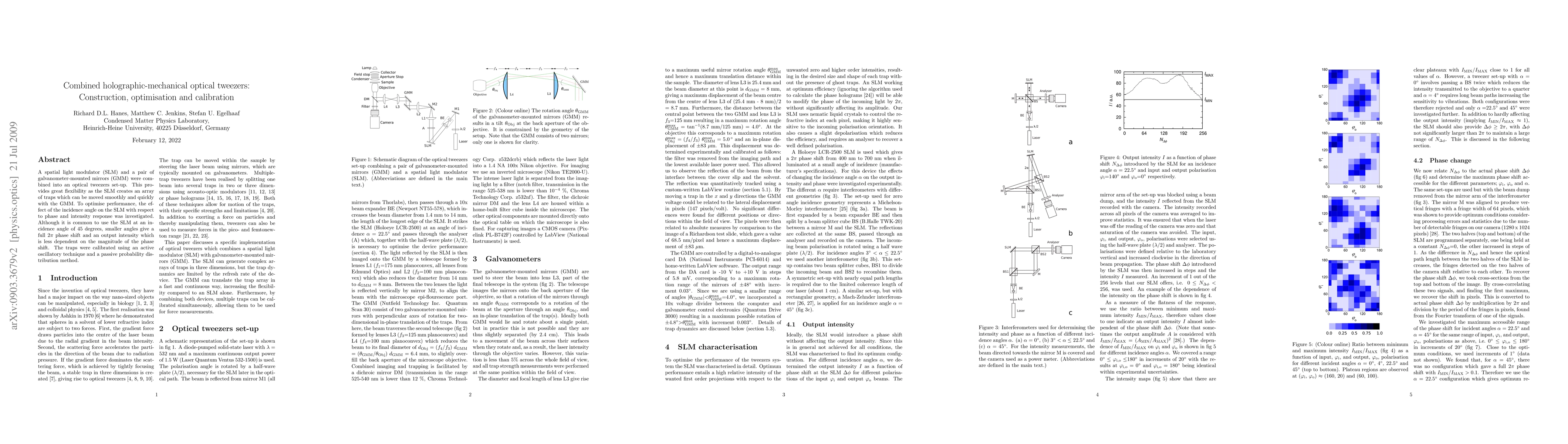 A spatial light modulator (SLM) and a pair of galvanometer-mounted mirrors (GMM) were combined into an optical tweezers set-up. This provides great flexibility as the SLM creates an array of traps which can be moved smoothly and quickly with the GMM. To optimise performance, the effect of the incidence angle on the SLM with respect to phase and intensity response was investigated. Although it is common to use the SLM at an incidence angle of 45 degrees, smaller angles give a full 2pi phase shift and an output intensity which is less dependent on the magnitude of the phase shift. The traps were calibrated using an active oscillatory technique and a passive probability distribution method.