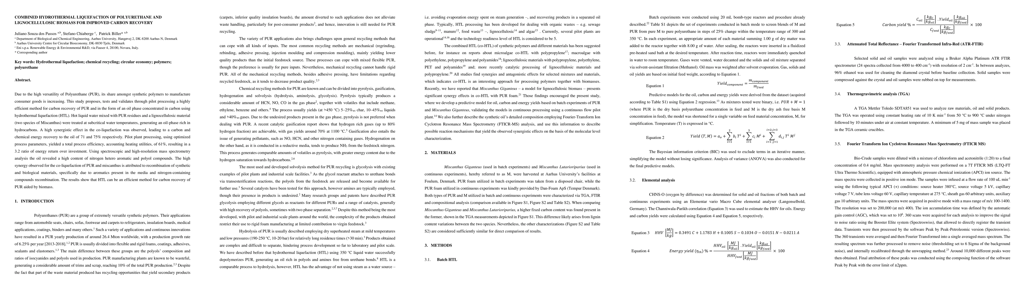 This study proposes a hydrothermal liquefaction method for efficient carbon recovery from polyurethane and lignocellulosic biomass, achieving 71% carbon and 75% chemical energy recovery. The synergistic co-liquefaction of polyurethane and Miscanthus resulted in a 61% process efficiency and a 3.2 energy return over investment ratio.