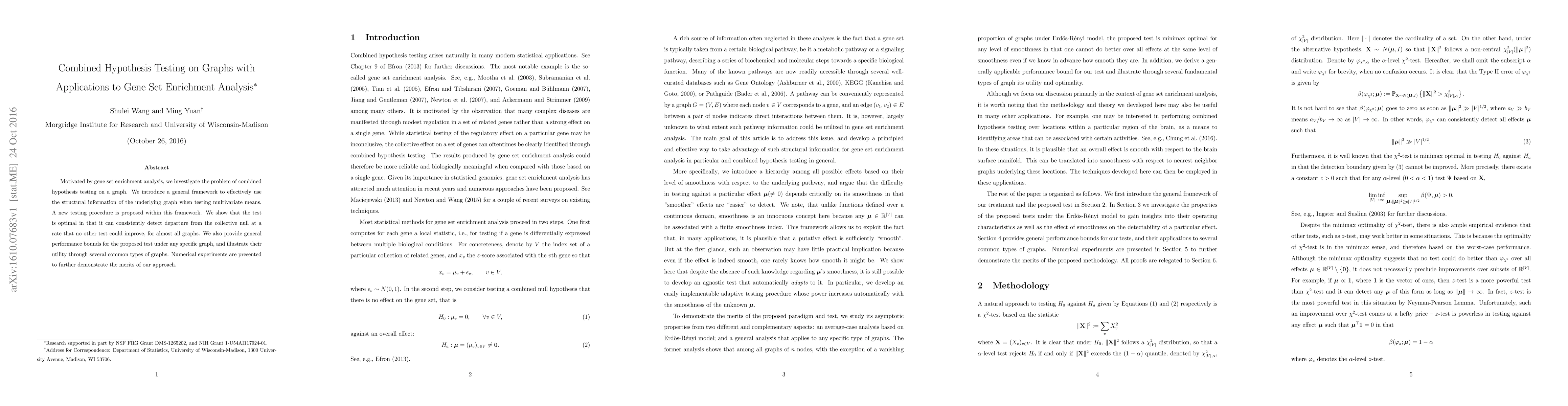 This paper proposes a novel framework for combined hypothesis testing on graphs, specifically tailored for gene set enrichment analysis. The introduced testing procedure leverages graph structure to optimally detect multivariate mean departures, demonstrating superior performance across various graph types.
