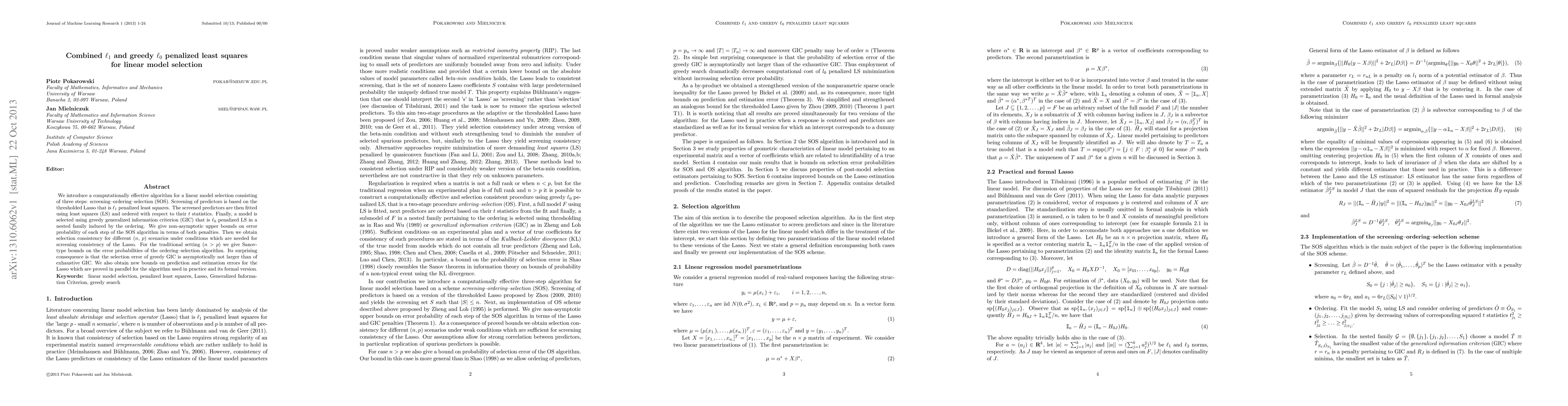 We introduce a computationally effective algorithm for a linear model selection consisting of three steps: screening--ordering--selection (SOS). Screening of predictors is based on the thresholded Lasso that is l_1 penalized least squares. The screened predictors are then fitted using least squares (LS) and ordered with respect to their t statistics. Finally, a model is selected using greedy generalized information criterion (GIC) that is l_0 penalized LS in a nested family induced by the ordering. We give non-asymptotic upper bounds on error probability of each step of the SOS algorithm in terms of both penalties. Then we obtain selection consistency for different (n, p) scenarios under conditions which are needed for screening consistency of the Lasso. For the traditional setting (n >p) we give Sanov-type bounds on the error probabilities of the ordering--selection algorithm. Its surprising consequence is that the selection error of greedy GIC is asymptotically not larger than of exhaustive GIC. We also obtain new bounds on prediction and estimation errors for the Lasso which are proved in parallel for the algorithm used in practice and its formal version.