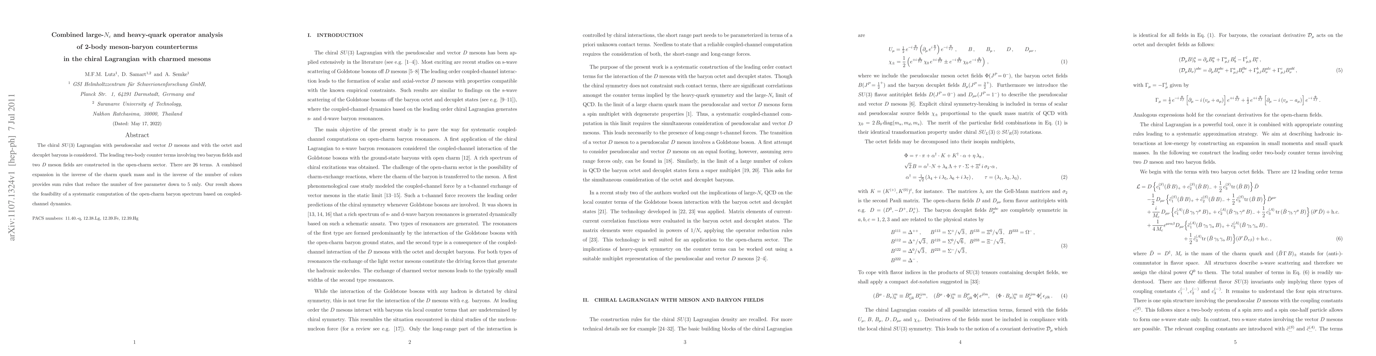 The chiral SU(3) Lagrangian with pseudoscalar and vector $D$ mesons and with the octet and decuplet baryons is considered. The leading two-body counter terms involving two baryon fields and two $D$ meson fields are constructed in the open-charm sector. There are 26 terms. A combined expansion in the inverse of the charm quark mass and in the inverse of the number of colors provides sum rules that reduce the number of free parameter down to 5 only. Our result shows the feasibility of a systematic computation of the open-charm baryon spectrum based on coupled-channel dynamics.