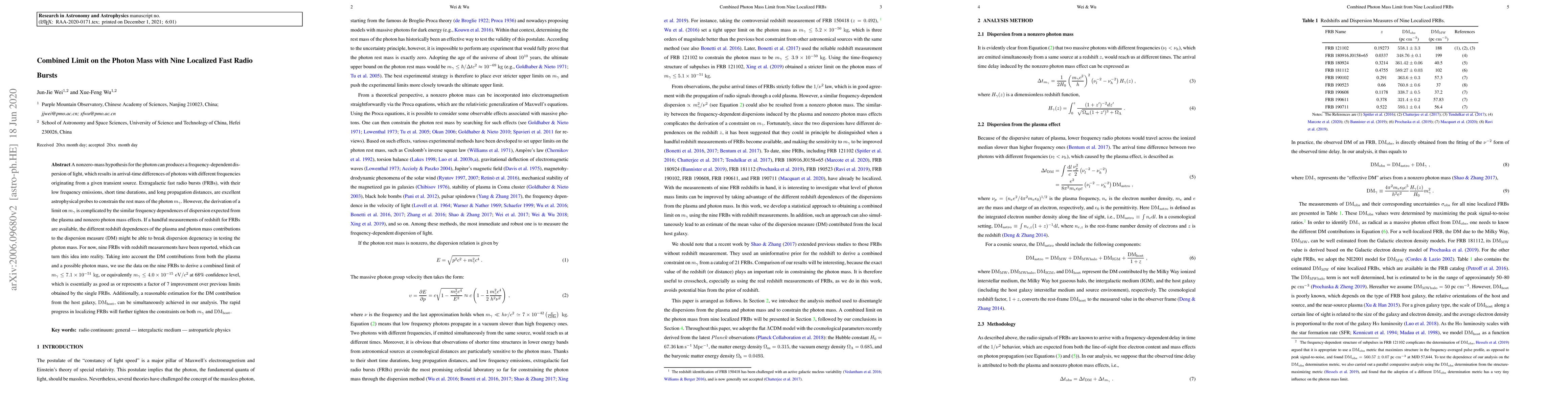 A nonzero-mass hypothesis for the photon can produces a frequency-dependent dispersion of light, which results in arrival-time differences of photons with different frequencies originating from a given transient source. Extragalactic fast radio bursts (FRBs), with their low frequency emissions, short time durations, and long propagation distances, are excellent astrophysical probes to constrain the rest mass of the photon $m_{\gamma}$. However, the derivation of a limit on $m_{\gamma}$ is complicated by the similar frequency dependences of dispersion expected from the plasma and nonzero photon mass effects. If a handful measurements of redshift for FRBs are available, the different redshift dependences of the plasma and photon mass contributions to the dispersion measure (DM) might be able to break dispersion degeneracy in testing the photon mass. For now, nine FRBs with redshift measurements have been reported, which can turn this idea into reality. Taking into account the DM contributions from both the plasma and a possible photon mass, we use the data on the nine FRBs to derive a combined limit of $m_{\gamma}\leq7.1\times10^{-51}\;{\rm kg}$, or equivalently $m_{\gamma}\leq4.0\times10^{-15}\; {\rm eV}/c^{2}$ at 68\% confidence level, which is essentially as good as or represents a factor of 7 improvement over previous limits obtained by the single FRBs. Additionally, a reasonable estimation for the DM contribution from the host galaxy, $\rm DM_{host}$, can be simultaneously achieved in our analysis. The rapid progress in localizing FRBs will further tighten the constraints on both $m_{\gamma}$ and $\rm DM_{host}$.