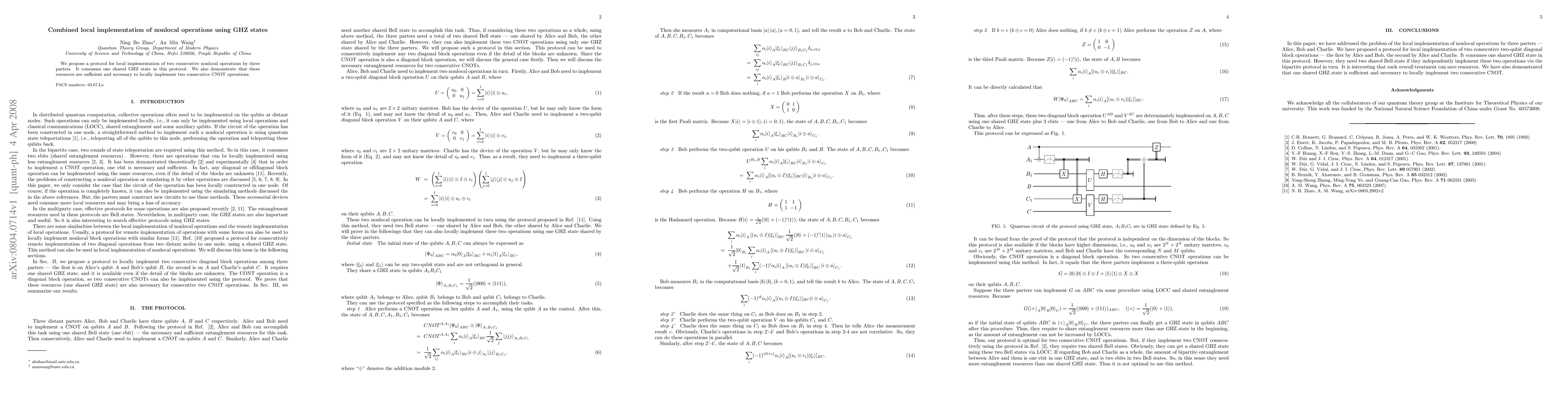 Summary: This paper proposes a protocol for locally implementing two consecutive nonlocal operations among three parties using a single GHZ state. It proves that this resource is both sufficient and necessary for locally executing two consecutive CNOT operations.