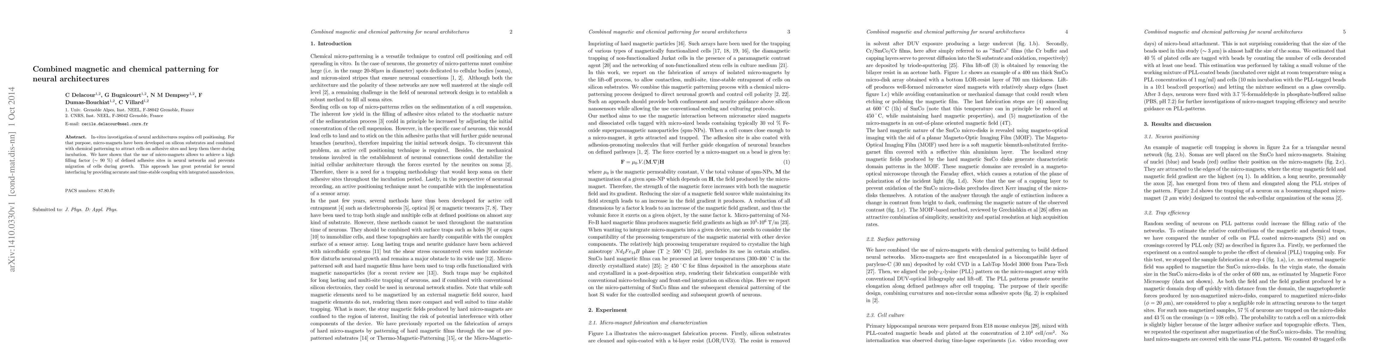 In vitro investigation of neural architectures requires cell positioning. For that purpose, micro-magnets have been developed on silicon substrates and combined with chemical patterning to attract cells to adhesive sites and keep them there during incubation. We have shown that the use of micro-magnets allows to achieve a high filling factor (~90%) of defined adhesive sites in neural networks and prevents migration of cells during growth. This approach has great potential for neural interfacing by providing accurate and time-stable coupling with integrated nanodevices.