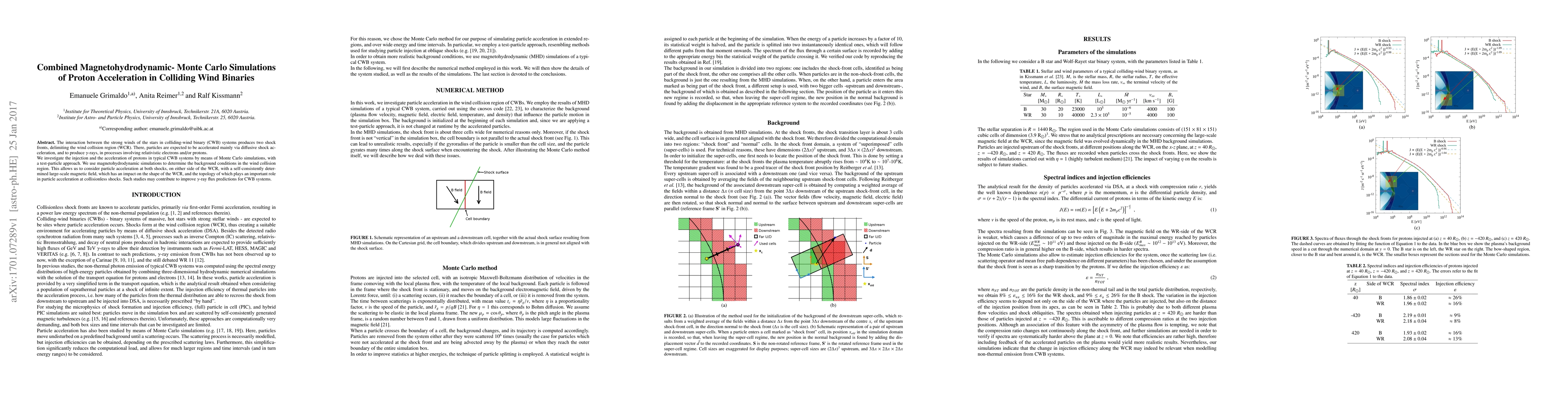 The interaction between the strong winds of the stars in colliding-wind binary (CWB) systems produces two shock fronts, delimiting the wind collision region (WCR). There, particles are expected to be accelerated mainly via diffusive shock acceleration, and to produce $\gamma$-rays, in processes involving relativistic electrons and/or protons. We investigate the injection and the acceleration of protons in typical CWB systems by means of Monte Carlo simulations, with a test-particle approach. We use magnetohydrodynamic simulations to determine the background conditions in the wind collision region. This allows us to consider particle acceleration at both shocks, on either side of the WCR, with a self-consistently determined large-scale magnetic field, which has an impact on the shape of the WCR, and the topology of which plays an important role in particle acceleration at collisionless shocks. Such studies may contribute to improve $\gamma$-ray flux predictions for CWB systems.