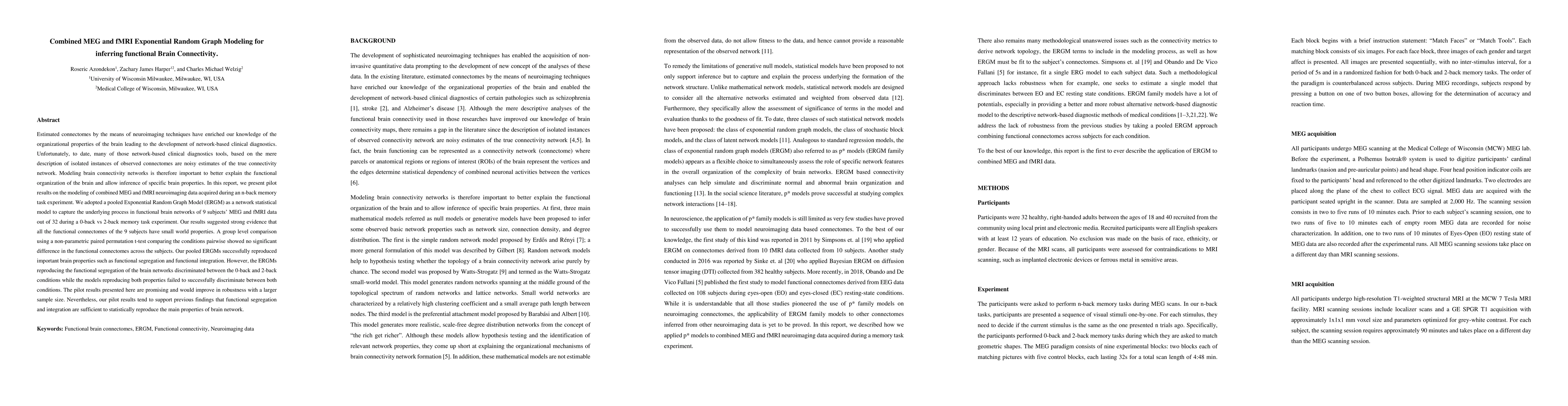 This paper explores the use of combined MEG and fMRI data with Exponential Random Graph Modeling (ERGM) to infer functional brain connectivity during n-back memory tasks. The study found that ERGMs can reproduce small-world properties and functional segregation and integration, though they were not effective in discriminating between task conditions. The results suggest potential for network-based clinical diagnostics with larger sample sizes.