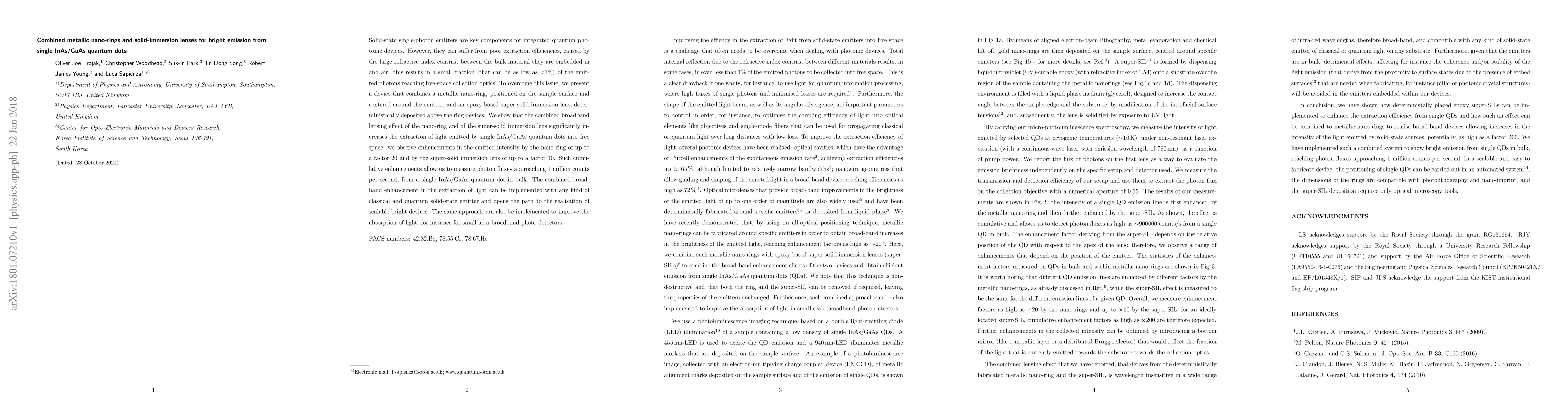 This paper presents a device combining metallic nano-rings and super-solid immersion lenses to significantly enhance the extraction efficiency of light from single InAs/GaAs quantum dots, achieving up to a 20-fold increase via the nano-rings and a 10-fold increase via the lenses, enabling photon fluxes of nearly 1 million counts per second. This method can be broadly applied to improve both light extraction and absorption in various solid-state emitters.