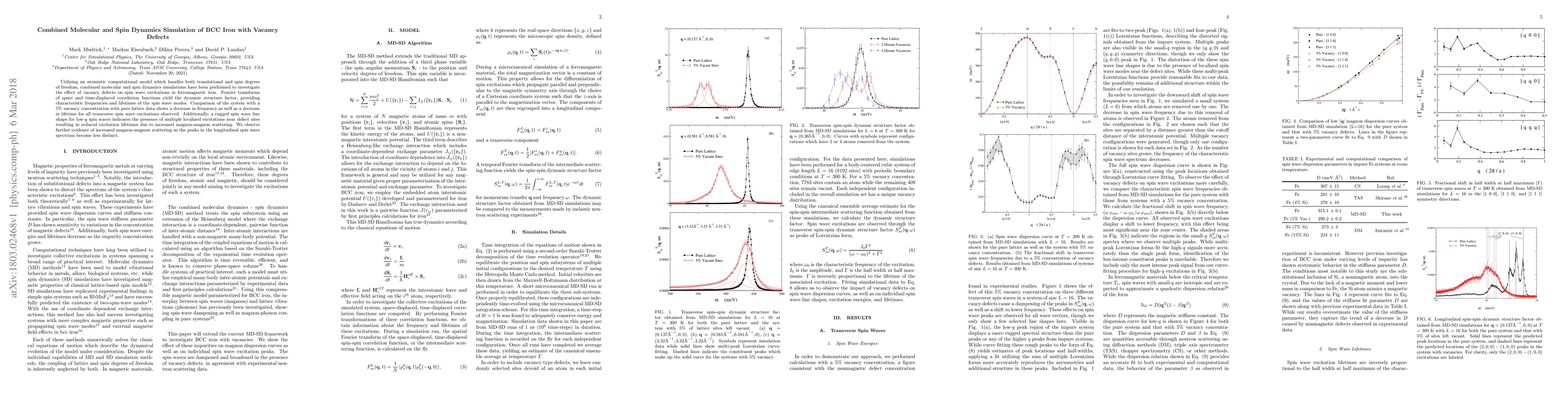 This study combines molecular and spin dynamics simulations to explore how vacancy defects in BCC iron affect spin wave excitations. Results show a decrease in frequency and lifetime for transverse spin waves, with increased magnon-magnon scattering due to localized excitations near defect sites.