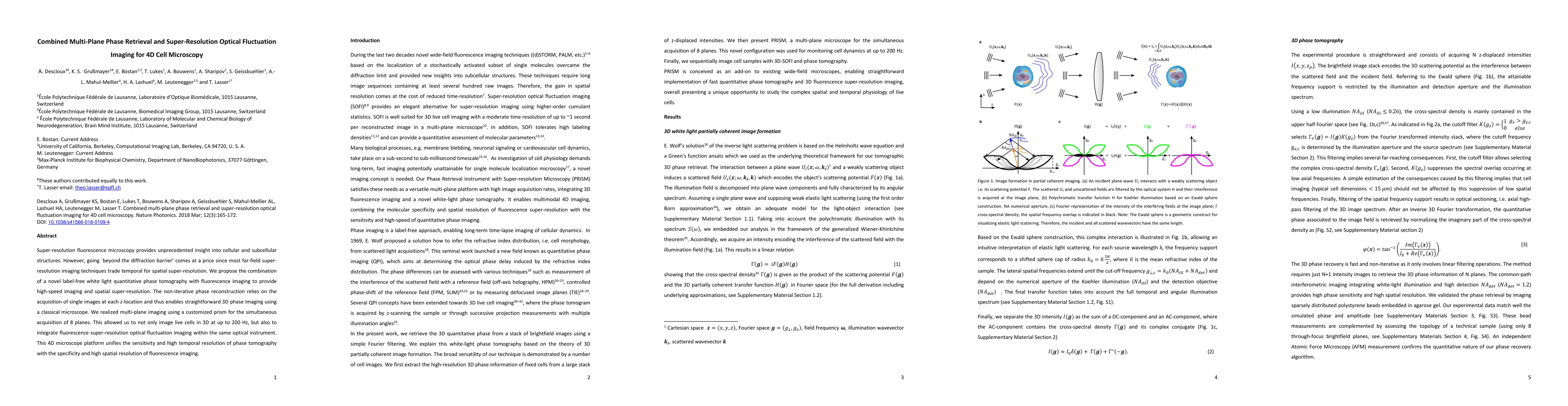 This paper proposes a combined multi-plane tomographic phase retrieval and stochastic optical fluctuation imaging technique for 4D cell microscopy, achieving high-speed 3D phase imaging and integrating fluorescence super-resolution within a single optical instrument. The method leverages label-free white light quantitative phase tomography and fluorescence imaging to provide both temporal and spatial super-resolution.