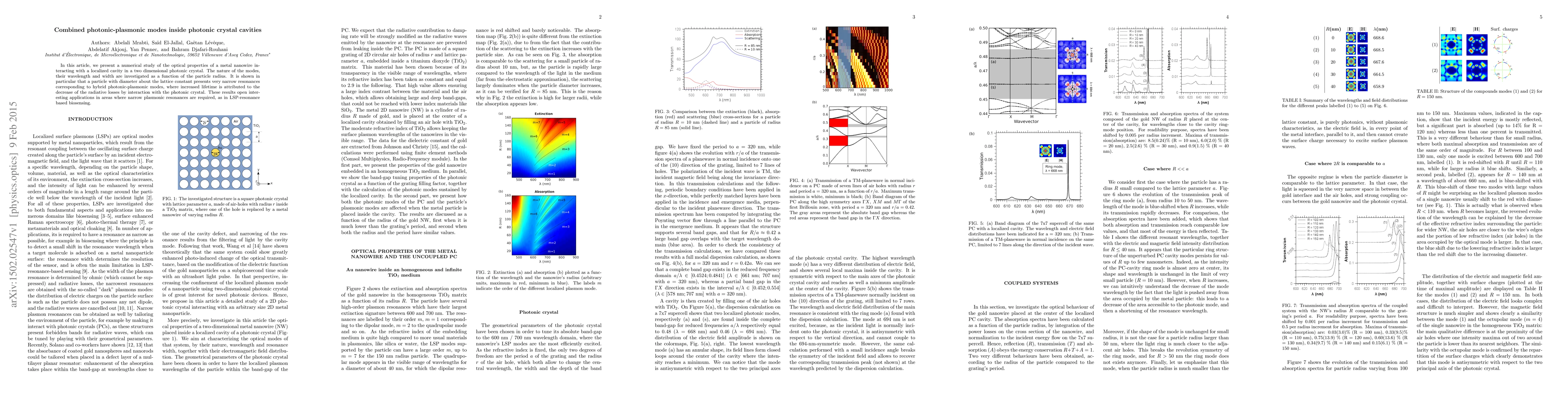 In this article, we present a numerical study of the optical properties of a metal nanowire interacting with a localized cavity in a two dimensional photonic crystal. The nature of the modes, their wavelength and width are investigated as a function of the particle radius. It is shown in particular that a particle with diameter about the lattice constant presents very narrow resonances corresponding to hybrid photonic-plasmonic modes, where increased lifetime is attributed to the decrease of the radiative losses by interaction with the photonic crystal. These results open interesting applications in areas where narrow plasmonic resonances are required, as in LSP-resonance based biosensing.