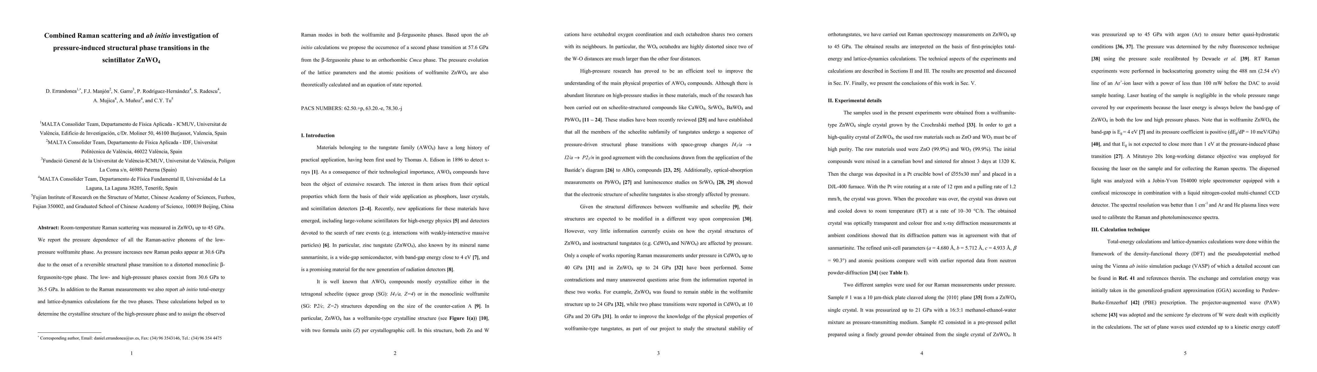 This study combines Raman scattering and ab initio calculations to investigate pressure-induced structural phase transitions in ZnWO4, identifying a reversible transition from wolframite to b-fergusonite at 30.6 GPa and a second transition to an orthorhombic Cmca phase at 57.6 GPa. The research provides detailed structural insights and an equation of state for the lattice parameters.