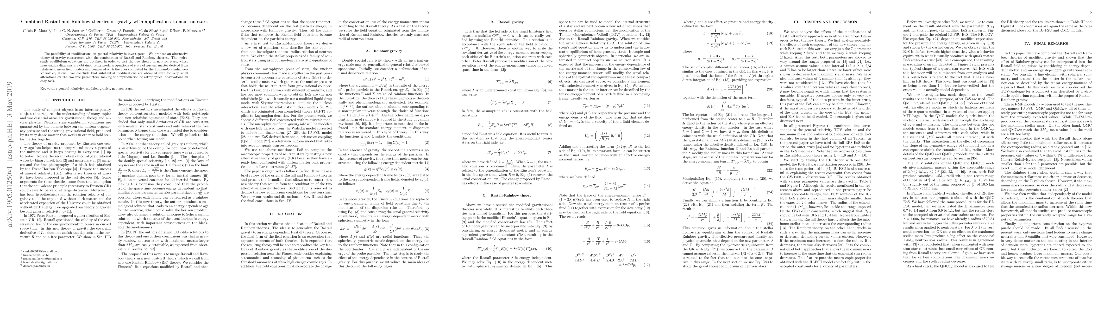 The possibility of modifications on general relativity is investigated. We propose an alternative theory of gravity constructed with the combination of Rastall and Rainbow theories. The hydrostatic equilibrium equations are obtained in order to test the new theory in neutron stars, whose mass-radius diagrams are obtained using modern equations of state of nuclear matter derived from relativistic mean field models and compared with the ones computed by the Tolman-Oppenheimer-Volkoff equations. We conclude that substantial modifications are obtained even for very small alterations on the two free parameters, making the reproduction of astrophysical observations an easy task.