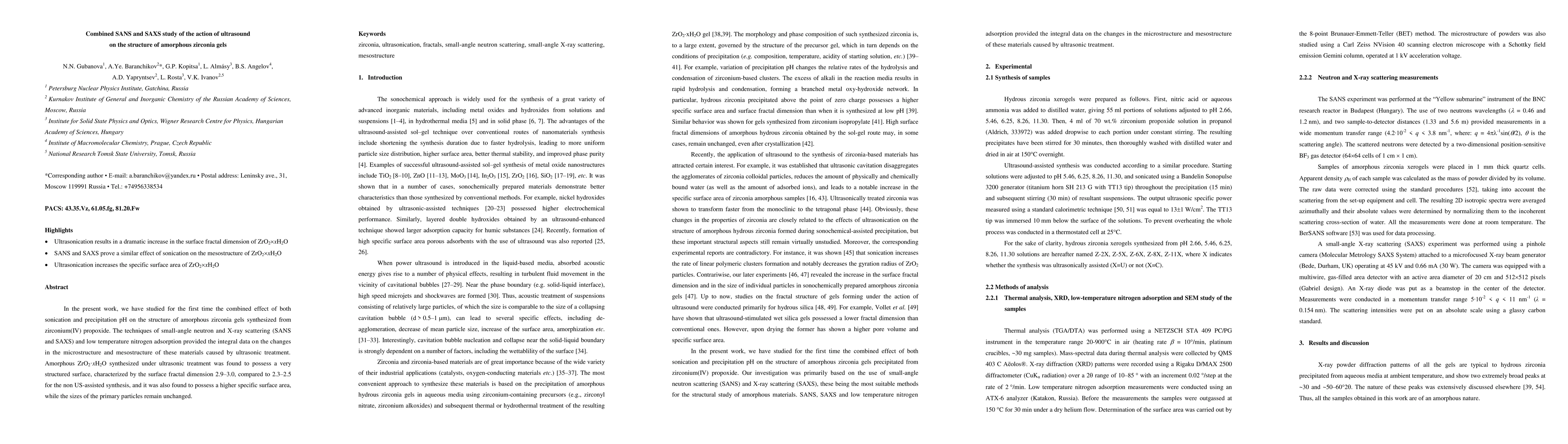 In the present work, we have studied for the first time the combined effect of both sonication and precipitation pH on the structure of amorphous zirconia gels synthesized from zirconium(IV) propoxide. The techniques of small-angle neutron and X-ray scattering (SANS and SAXS) and low temperature nitrogen adsorption provided the integral data on the changes in the microstructure and mesostructure of these materials caused by ultrasonic (US) treatment. Amorphous ZrO2.xH2O synthesized under ultrasonic treatment was found to possess a very structured surface, characterized by the surface fractal dimension 2.9-3.0, compared to 2.3-2.5 for the non US-assisted synthesis, and it was also found to possess a higher specific surface area, while the sizes of the primary particles remain unchanged.
