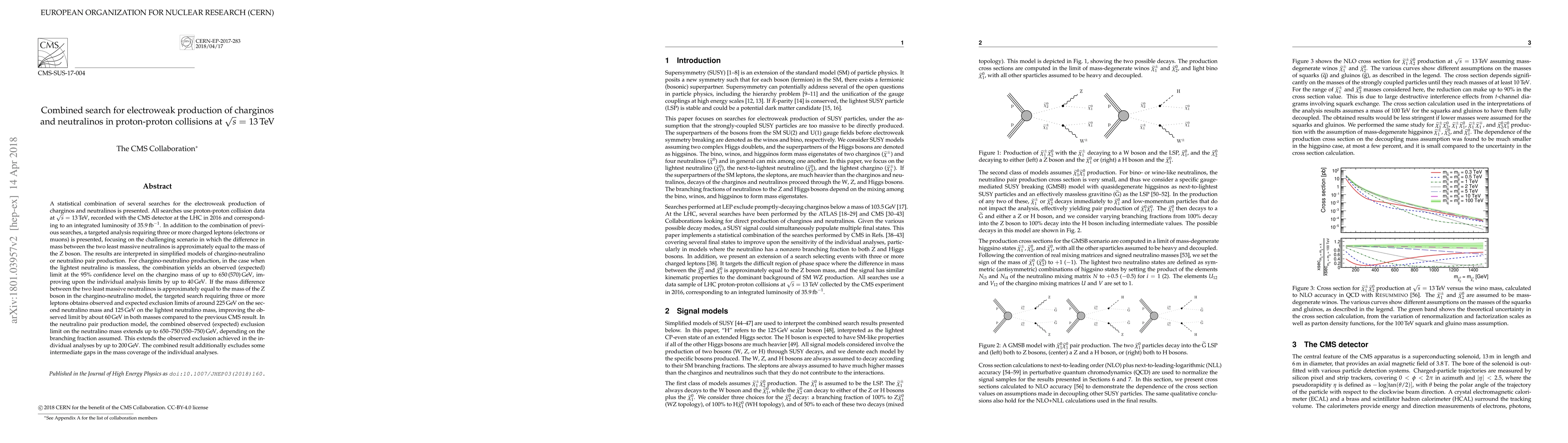 This paper presents a statistical combination of searches for electroweak production of charginos and neutralinos in proton-proton collisions at 13 TeV, using CMS detector data from 2016. The combination improves exclusion limits on chargino and neutralino masses, achieving up to 650 GeV for charginos and 225 GeV for the second neutralino in specific scenarios.