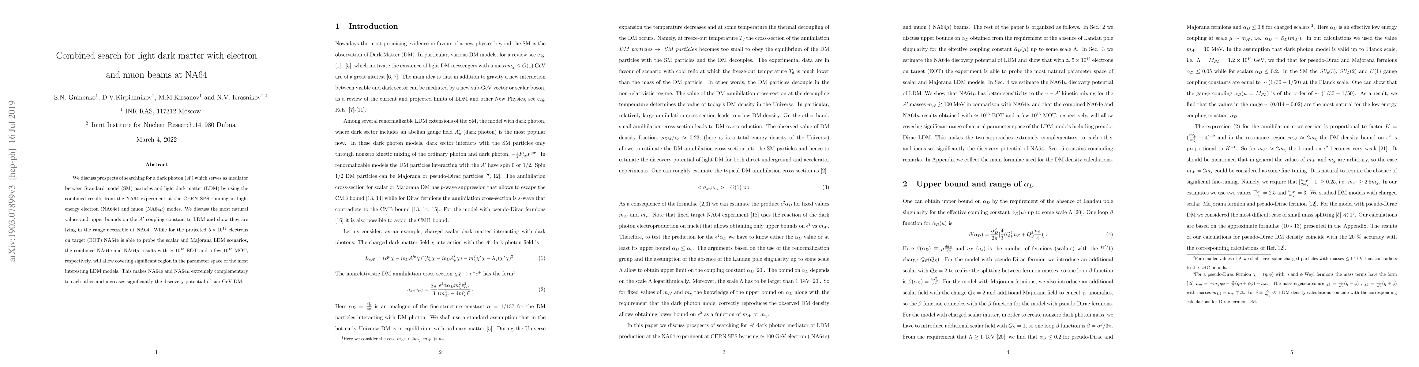 The NA64 experiment at CERN aims to detect a dark photon ($A'$) as a mediator between Standard Model particles and light dark matter (LDM). Combining results from high-energy electron (NA64e) and muon (NA64$\mu$) modes enhances the search for LDM, with NA64e probing scalar and Majorana LDM scenarios and the combined data covering significant regions in LDM parameter space.