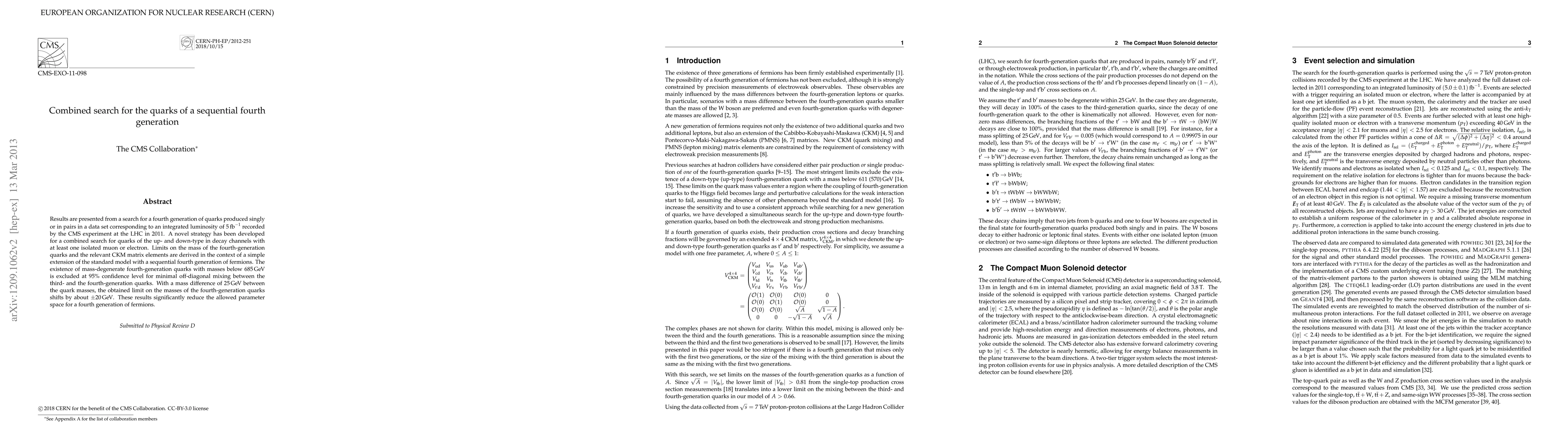 This paper reports a search for a sequential fourth generation of quarks using data from the CMS experiment at the LHC, employing a novel strategy to combine searches for up and down type quarks. The study excludes the existence of mass-degenerate fourth-generation quarks below 685 GeV at 95% confidence level, significantly reducing the allowed parameter space for such quarks.
