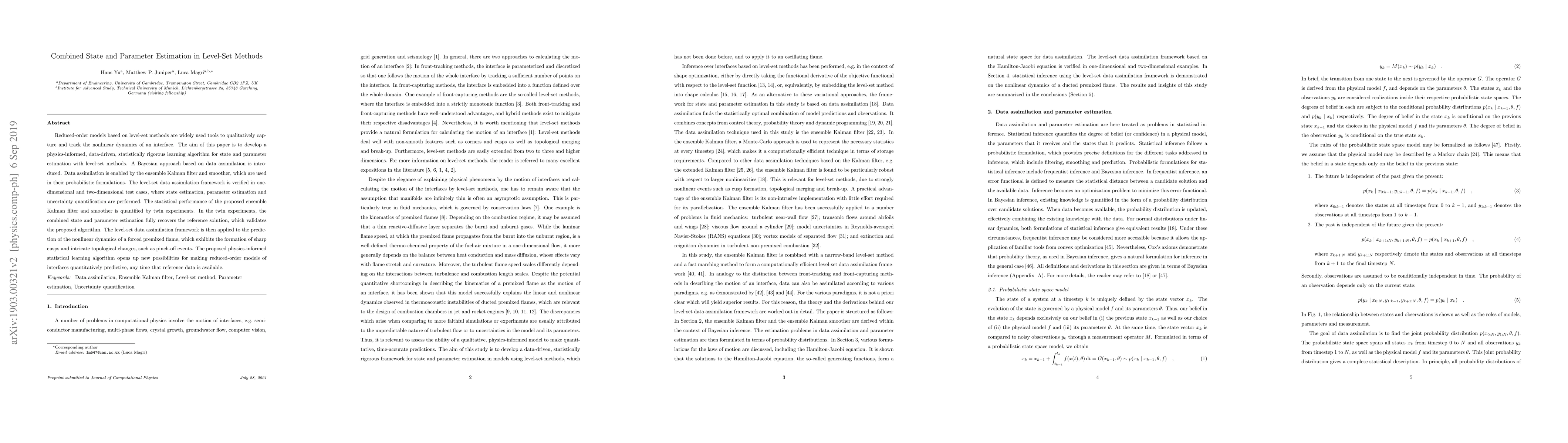 Reduced-order models based on level-set methods are widely used tools to qualitatively capture and track the nonlinear dynamics of an interface. The aim of this paper is to develop a physics-informed, data-driven, statistically rigorous learning algorithm for state and parameter estimation with level-set methods. A Bayesian approach based on data assimilation is introduced. Data assimilation is enabled by the ensemble Kalman filter and smoother, which are used in their probabilistic formulations. The level-set data assimilation framework is verified in onedimensional and two-dimensional test cases, where state estimation, parameter estimation and uncertainty quantification are performed. The statistical performance of the proposed ensemble Kalman filter and smoother is quantified by twin experiments. In the twin experiments, the combined state and parameter estimation fully recovers the reference solution, which validates the proposed algorithm. The level-set data assimilation framework is then applied to the prediction of the nonlinear dynamics of a forced premixed flame, which exhibits the formation of sharp cusps and intricate topological changes, such as pinch-off events. The proposed physics-informed statistical learning algorithm opens up new possibilities for making reduced-order models of interfaces quantitatively predictive, any time that reference data is available.