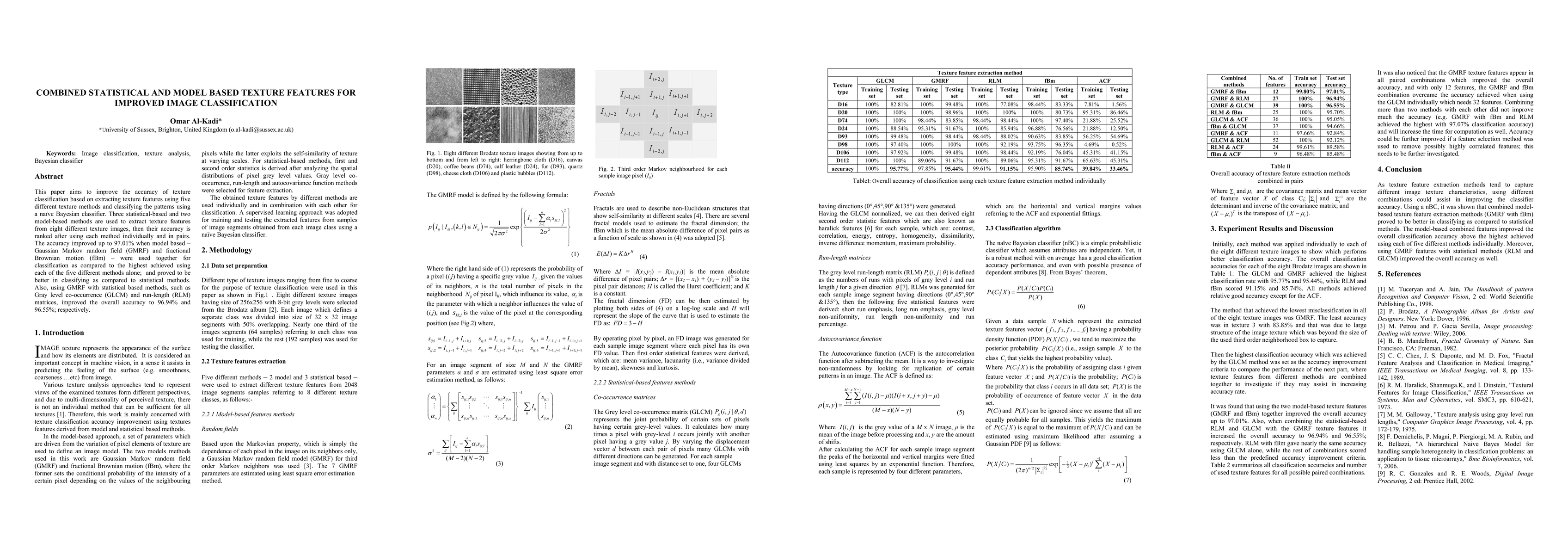 This paper enhances texture classification accuracy using a combination of statistical and model-based texture feature extraction methods, achieving up to 97.01% accuracy when using Gaussian Markov random field and fractional Brownian motion together. The combined approach outperformed individual methods and improved accuracy when paired with statistical methods.
