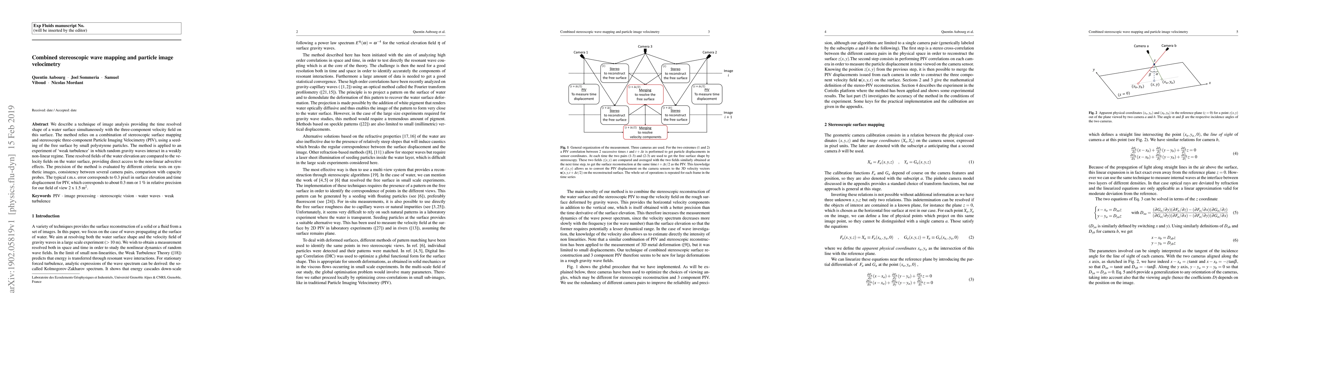 We describe a technique of image analysis providing the time resolved shape of a water surface simultaneously with the three-component velocity field on this surface. The method relies on a combination of stereoscopic surface mapping and stereoscopic three-component Particle Imaging Velocimetry (PIV), using a seeding of the free surface by small polystyrene particles. The method is applied to an experiment of `weak turbulence' in which random gravity waves interact in a weakly non-linear regime. Time resolved fields of the water elevation are compared to the velocity fields on the water surface, providing direct access to the non-linear advective effects. The precision of the method is evaluated by different criteria: tests on synthetic images, consistency between several camera pairs, comparison with capacity probes. The typical r.m.s. error corresponds to 0.3 pixel in surface elevation and time displacement for PIV, which corresponds to about 0.3 mm or 1 \% in relative precision for our field of view 2 x 1.5 m$^2$.
