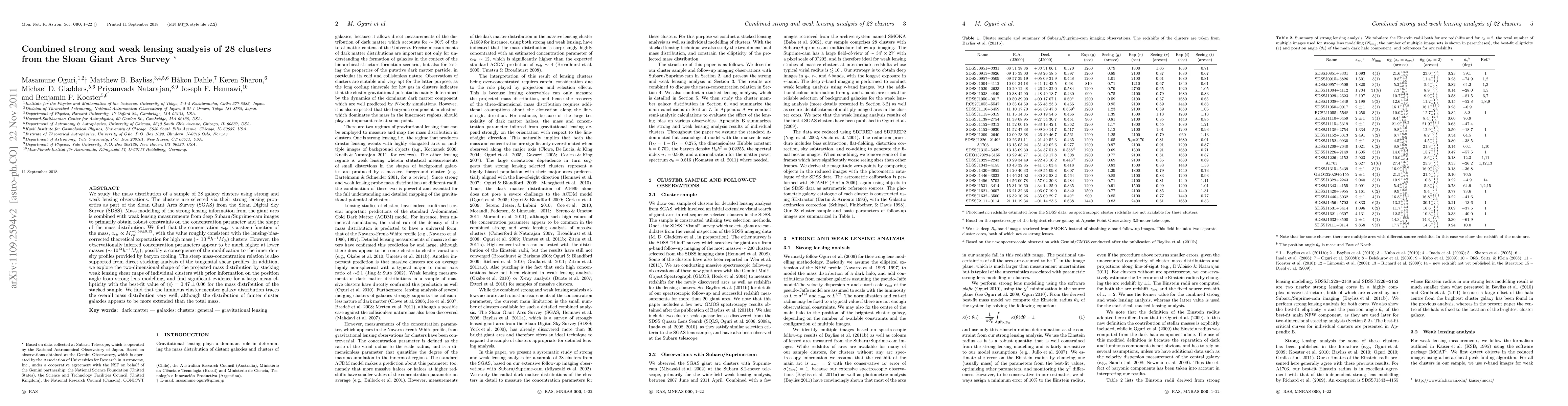 This paper combines strong and weak lensing analyses of 28 galaxy clusters from the Sloan Giant Arcs Survey to determine mass distribution and concentration parameters. The study finds a steep mass-concentration relation, suggesting higher concentration at lower masses, potentially due to baryon cooling effects. The analysis also reveals significant mean ellipticity in the projected mass distribution.