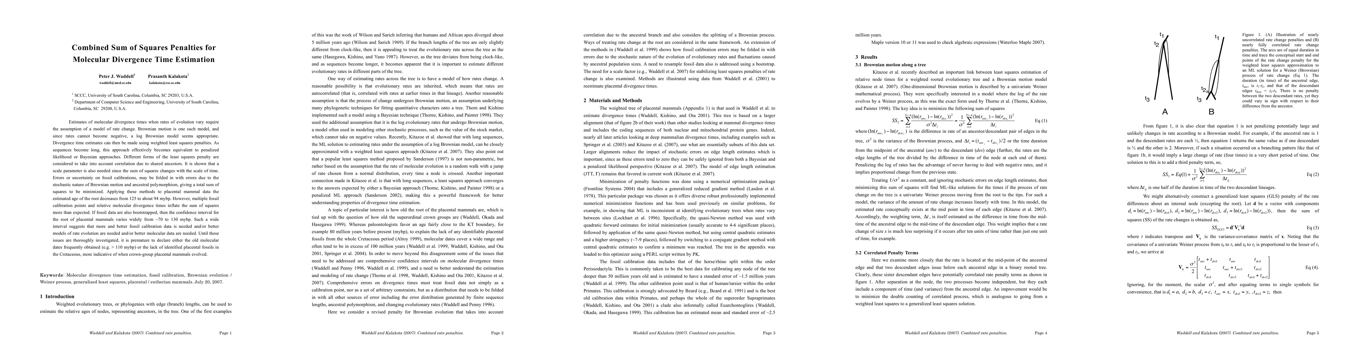 This paper proposes a combined sum of squares penalties method for estimating molecular divergence times under varying evolutionary rates, showing that the approach is equivalent to penalized likelihood or Bayesian methods for long sequences. The study finds that the estimated root age of placental mammals decreases significantly but highlights the need for better fossil calibration data and improved models to narrow the wide confidence interval.